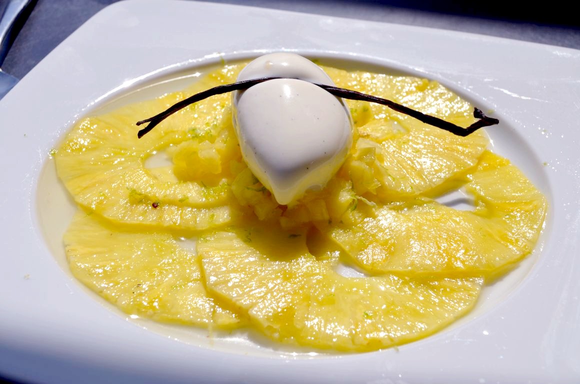 En dessert, je me suis laissée tenter par mon petit péché mignon, le baba au rhum, alors que ma voisine, plus sage, avait opté pour un très léger carpaccio d’ananas mariné au citron vert et vanille, et lait de coco frappé.