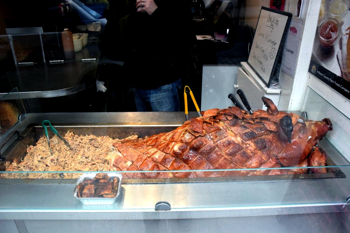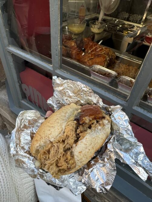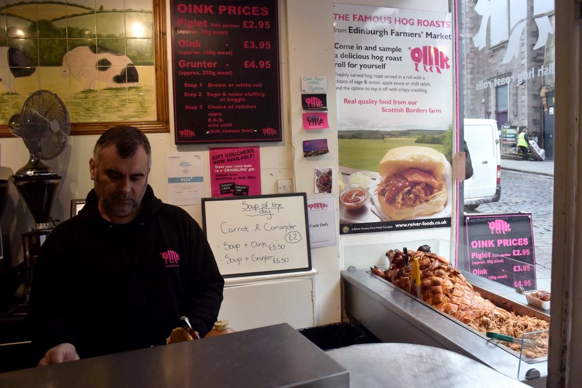 Oink est une mini-chaîne de « fast food » créée par deux fermiers écossais, qui souhaitaient faire découvrir aux habitants de la ville leurs produits naturels et de qualité. Ils ont ainsi créé les « hog roast rolls », des pains fourrés au pulled pork… tout simplement délicieux, et très frais : ils rôtissent un porc entier chaque matin, et quand il n’y en a plus… il n’y en a plus !