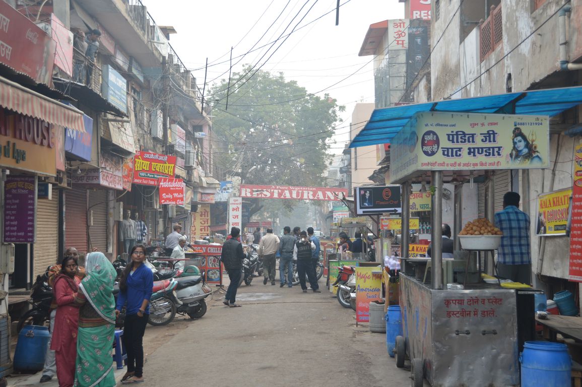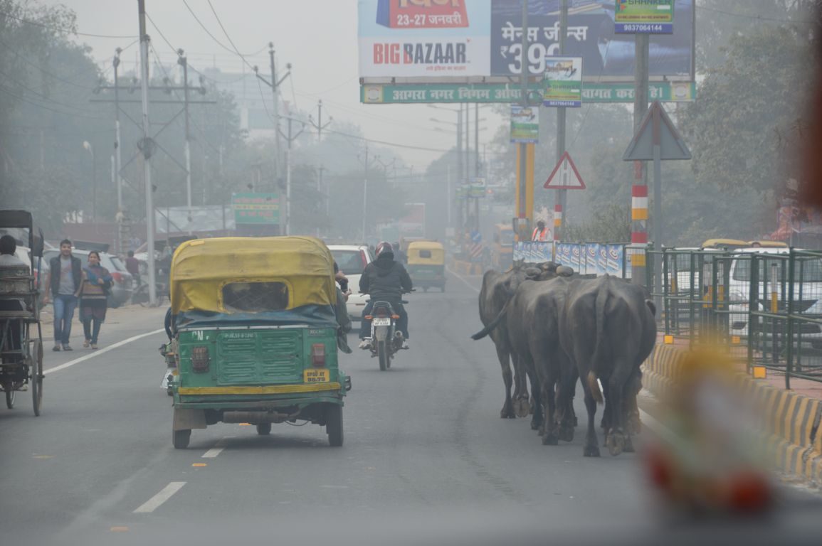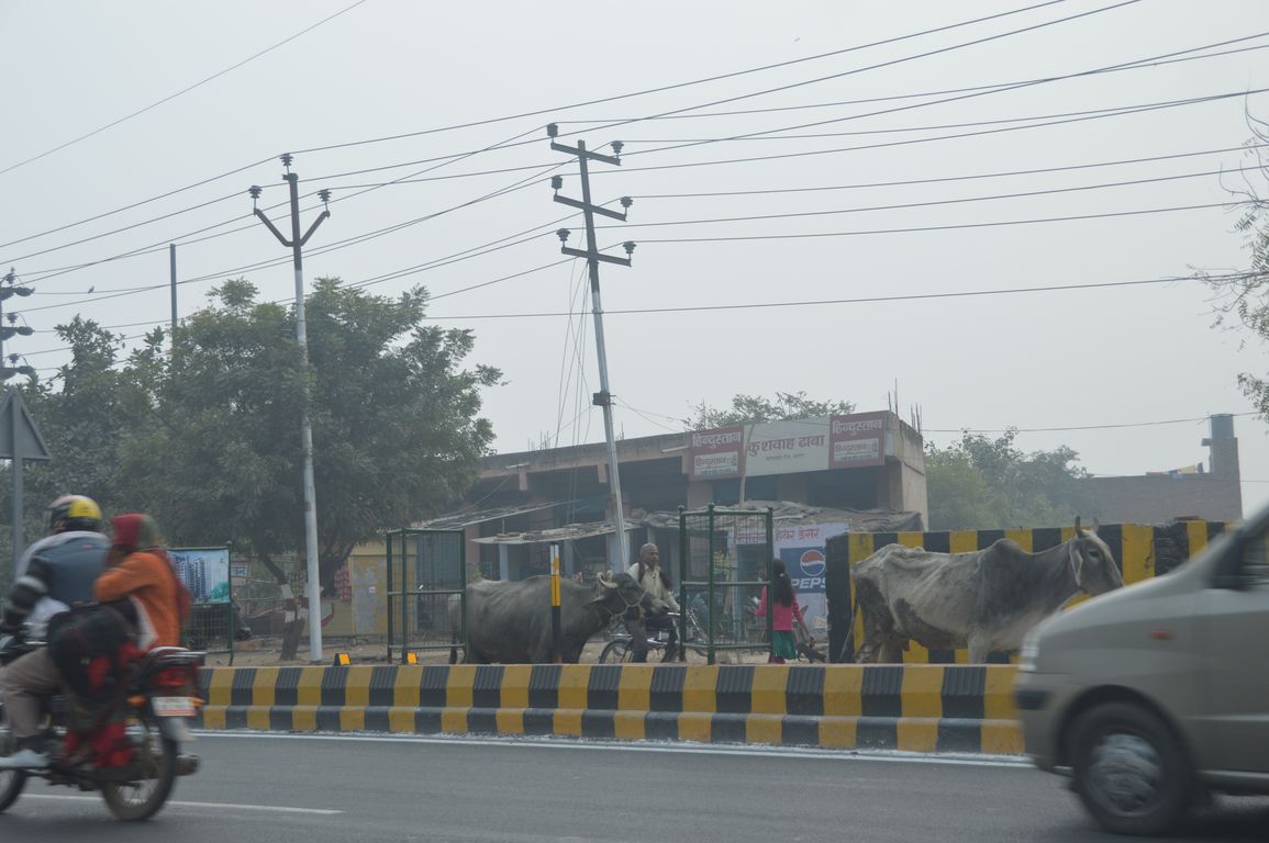 En moins de deux heures, nous arrivons dans la ville d’Agra. Dès l’entrée de la ville, nous découvrons toute une faune qui cohabite plus ou moins paisiblement avec les hommes: chiens, chèvres, mais aussi (encore et toujours) ces petits écureuils, et enfin, le plus frappant: des singes qui se promènent au milieu des hommes et les vaches, qui se balladent librement un peu partout, dans les poubelles, dans l’eau, mais aussi à contre sens sur la grand route. Quel chance pour elles d’être un animal sacré, les automobilistes y font plus attention qu’aux cyclistes et piétons !