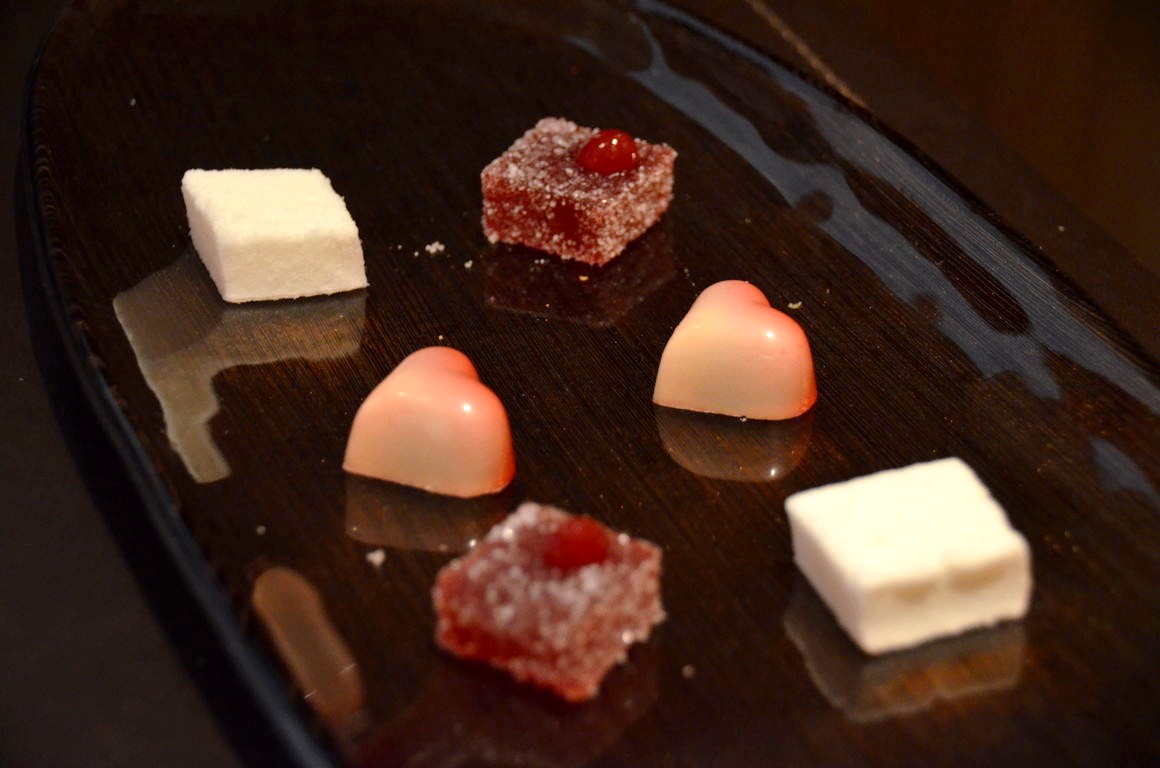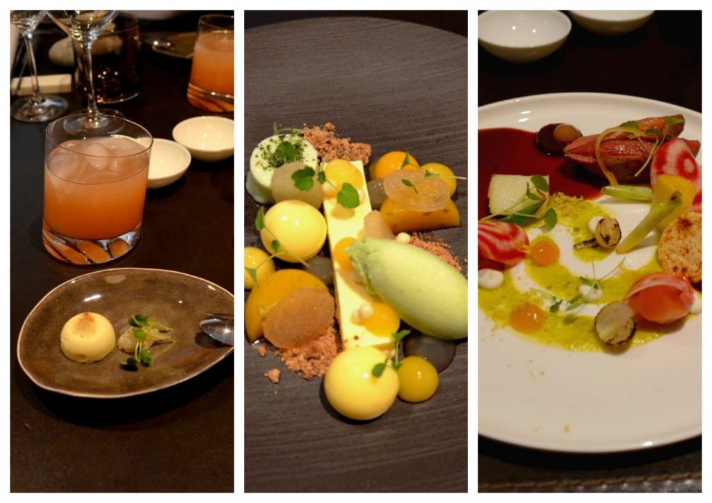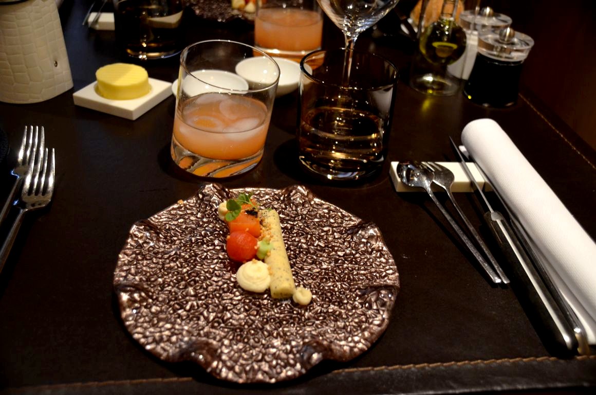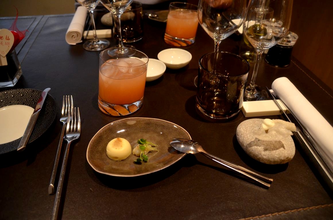 Nous optons pour le menu 4 services, avec en apéro quelques mises en bouches accompagnées d’un cocktail à base de pamplemousses de Floride.
