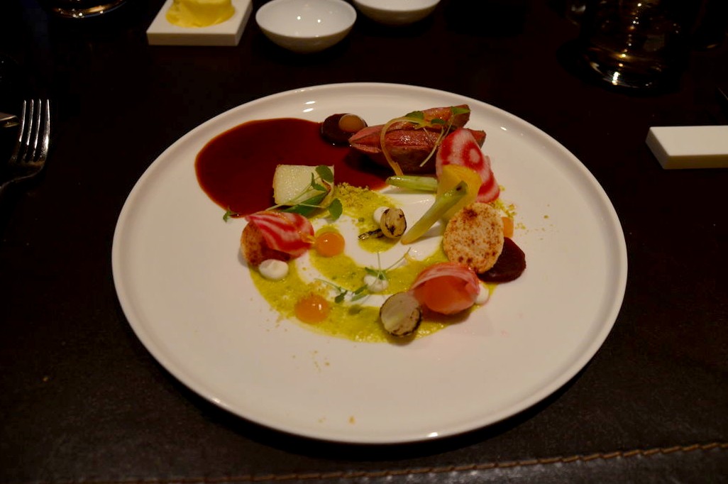 Vient ensuite le plat, le pigeonneau d’Anjou, pastilla aux épices d’Orient, crème d’amandes et pistaches, yaourt, menthe, coriandre et citron… que Fred avait déjà dégusté quelques semaines plutôt, car on y retrouve également des Pamplemousses de Floride ! Belle découverte pour moi que ce plat à la présentation qui plus est très agréable.