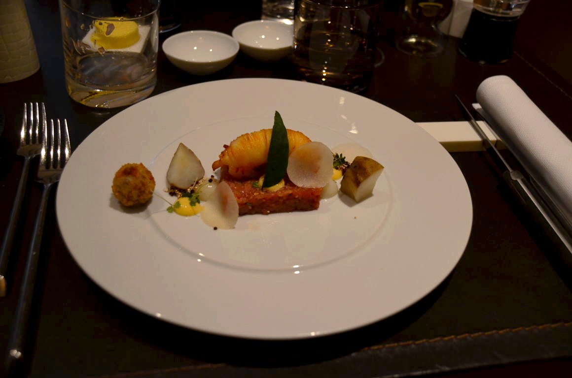 En entrée, nous dégustons une délicieuse association (sans être très originale) « terre et mer » de boeuf et langoustine : tartare de boeuf au topinambour, épeautre et langoustine poêlée.