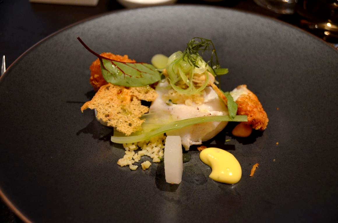 Le plat titille un peu plus nos papilles : il s’agit de cabillaud accompagné de moules, d’aïoli, et de sorbet à l’estragon, une touche très sympathique !