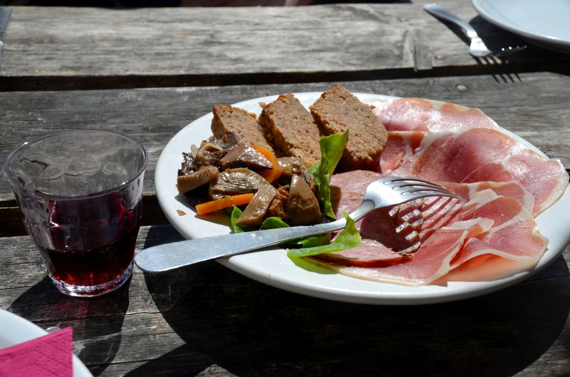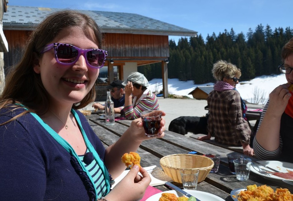 Nous y découvrons la spécialité locale, les beignets de pommes de terre, accompagnés de charcuteries et de fromages locaux (tomme et roblochon)… et d’un vin de Savoie bien entendu, une Mondeuse.