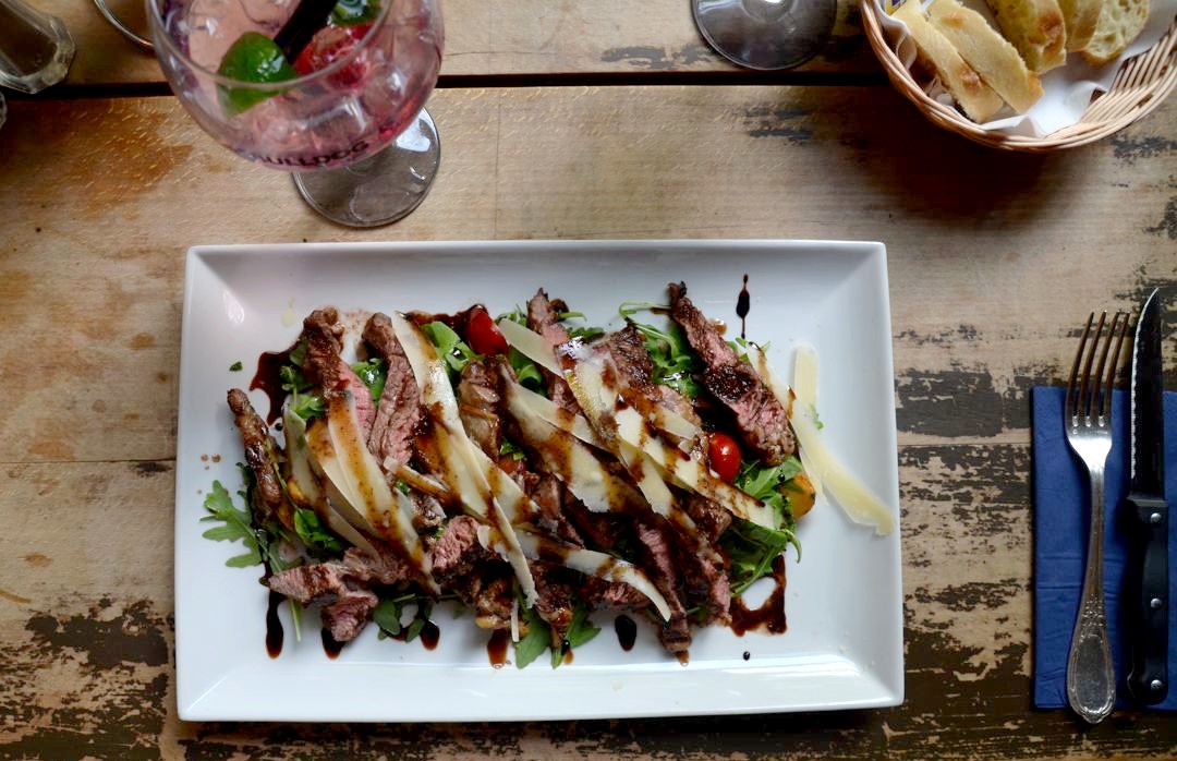 Et en plat principal, nous avons continué avec un Chicken burger aux saveurs du Sud, filet de poulet mariné, grillé, légumes grillés, mozzarella, frites et mayonnaise au basilic pour Fred, et avec une impressionnante assiette de tagliata (émincé) de boeuf irlandais façon « Malte » (accompagnée de pommes de terre grenailles, roquette, tomates, parmesan et pesto)… J’en salive encore !