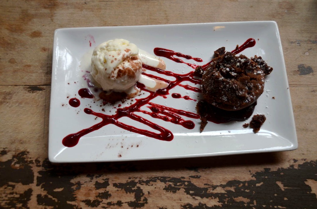 Enfin, en dessert, nous avons tous les deux craqué pour un moelleux au chocolat maison » façon Sébastien » accompagné d’une petite glace au lait d’amande…