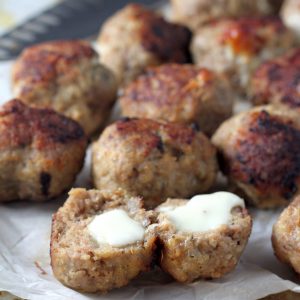 Just scoop a little smidge of meat in your hand, place the cheese smack dab in the center, then add another little bit of meat on top of it. Roll the meatball around in your hands a few times to seal the deal, and repeat with the remaining meatballs and cheese. This will only take a few minutes if you work fast – if you have a husband/girlfriend/kid/or parent that’s down for helping here, it’ll go even faster!