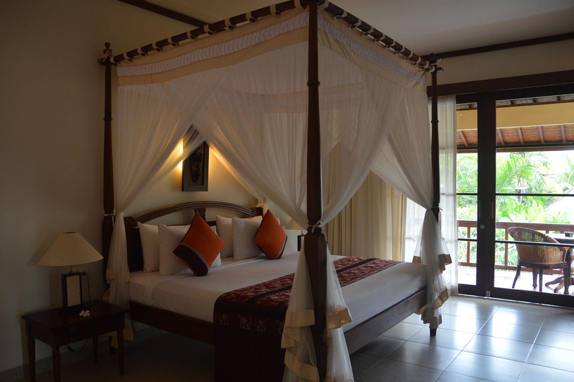 Avant une bonne nuit bien méritée pour Fred et moi, je finirai donc avec les photos de l’hôtel Kori Ubud Resort, de son restaurant (merci mon dieu une cuisine moins grasse, c’est bon pour les kilos en trop ça), de ses deux piscines et de notre chambre deluxe, ééénorme!! Et avec vue sur la forêt et les rizières, en plus… Enfin, pour le reste, rendez-vous demain pour la première journée de visite de l’île, avec du rafting et du vélo au programme !