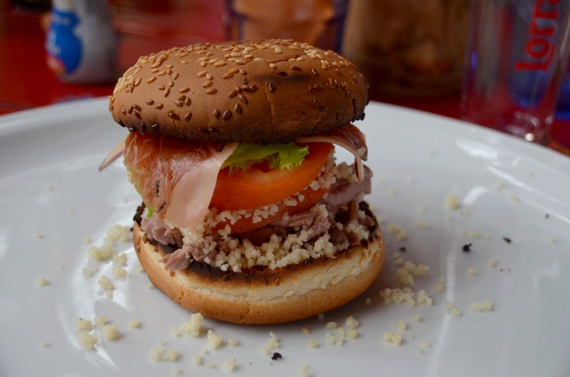 Et puisque la folie des burgers est arrivée jusqu’ici, le plat suivant sera un burger à base d’agneau de Martinique, accompagné d’une bonne bière locale, la Lorraine.