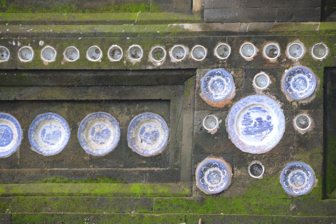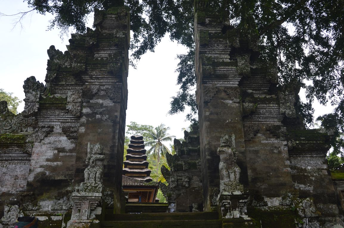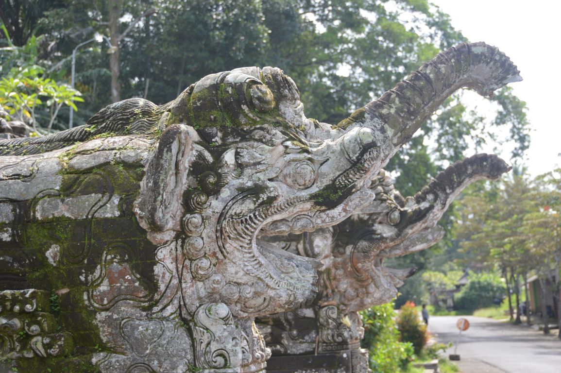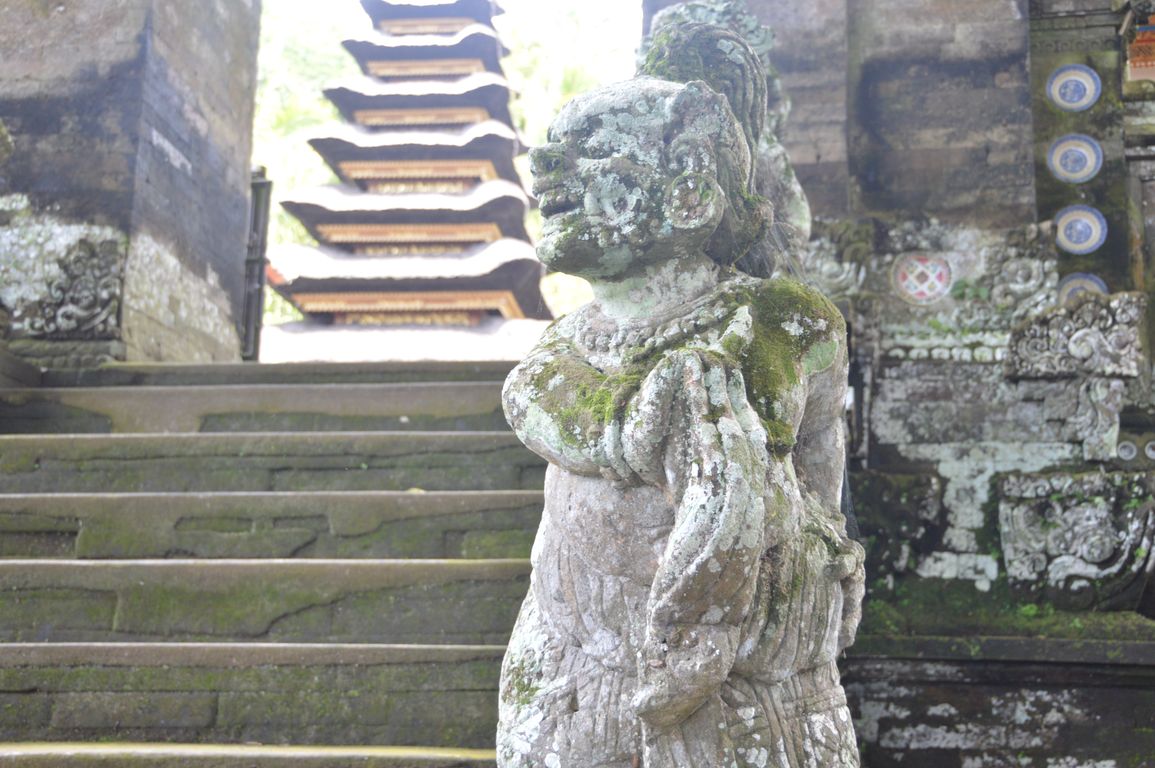 Nous redescendons ensuite vers le temple de Kehen, un des plus anciens temples hindous de Bali, et qui possède un énorme arbre banyan. On y retrouve également des éléments chinois, comme les assiettes en porcelaine bleue et blanche ornant les murs. Le temple principal, tout en haut, représente la terre, portée par une tortue et encerclée par un dragon qui la tient en place avec sa queue. Quand celui-ci s’endort, le lien se dénoue et ça fait un tremblement de terre… Jolie histoire, non?