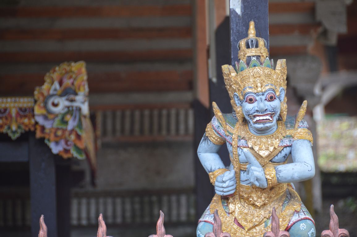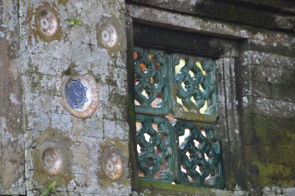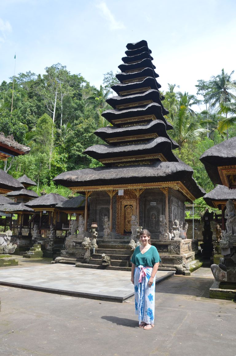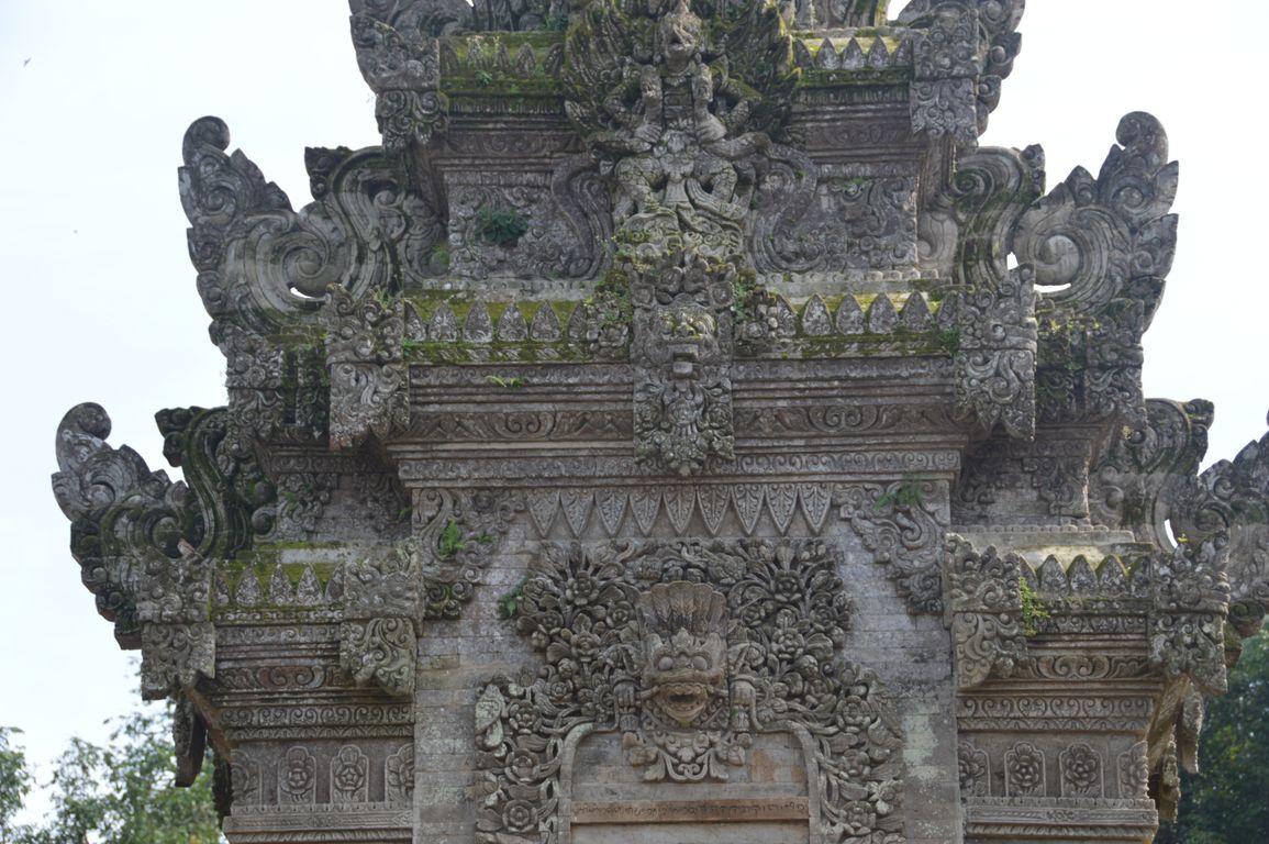 Nous redescendons ensuite vers le temple de Kehen, un des plus anciens temples hindous de Bali, et qui possède un énorme arbre banyan. On y retrouve également des éléments chinois, comme les assiettes en porcelaine bleue et blanche ornant les murs. Le temple principal, tout en haut, représente la terre, portée par une tortue et encerclée par un dragon qui la tient en place avec sa queue. Quand celui-ci s’endort, le lien se dénoue et ça fait un tremblement de terre… Jolie histoire, non?