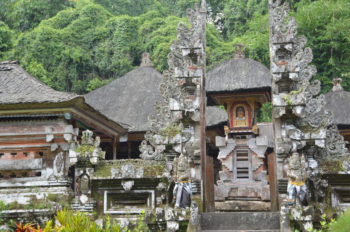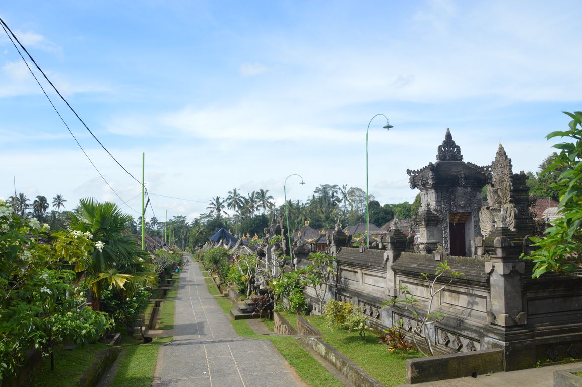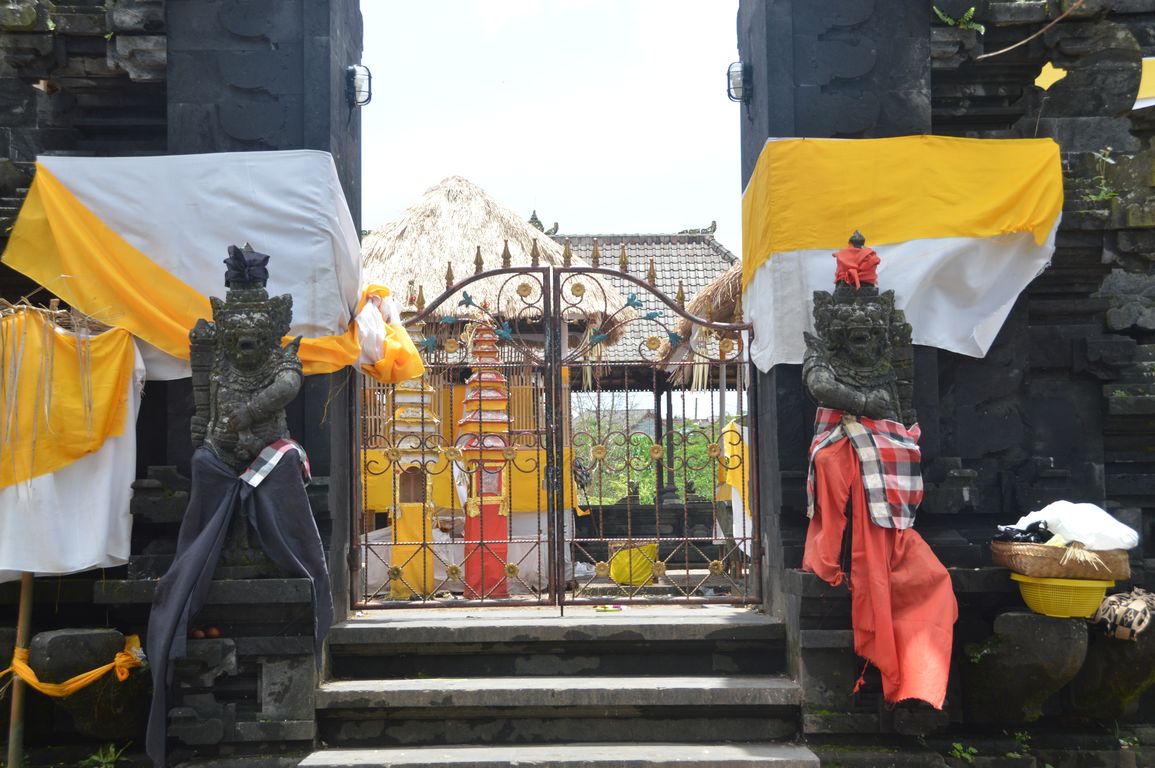 Première visite: celle de Penglipuran, un village traditionnel de campagne, constitué d’un alignement de maisons balinaises traditionnelles, avec chacune leur temple bien entendu, et dont l’orientation suit les règles du Feng-Shui: temple orienté vers les montagne, maisons divisées en pieds, corps et têtes,… Ici, pendant que les habitants travaillent, pas besoin de fermer la maison à clé: les chiens montent la garde devant les portails ! Un endroit de dépaysement total.