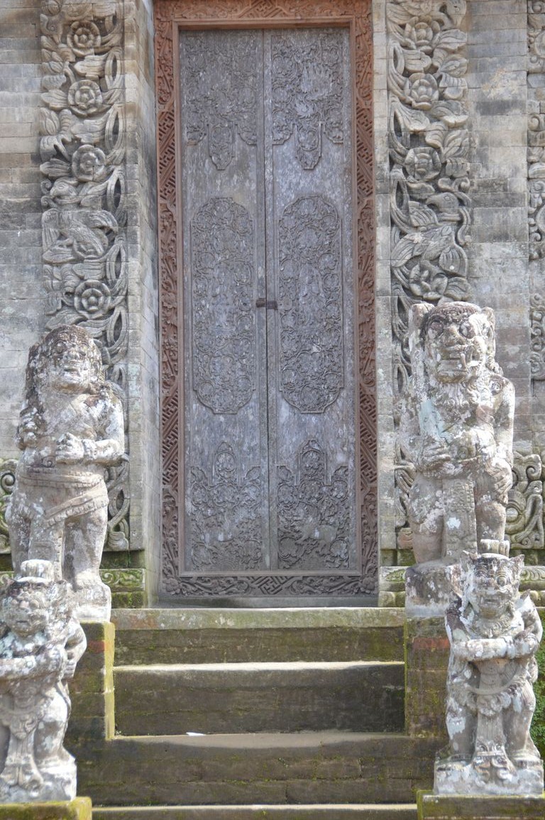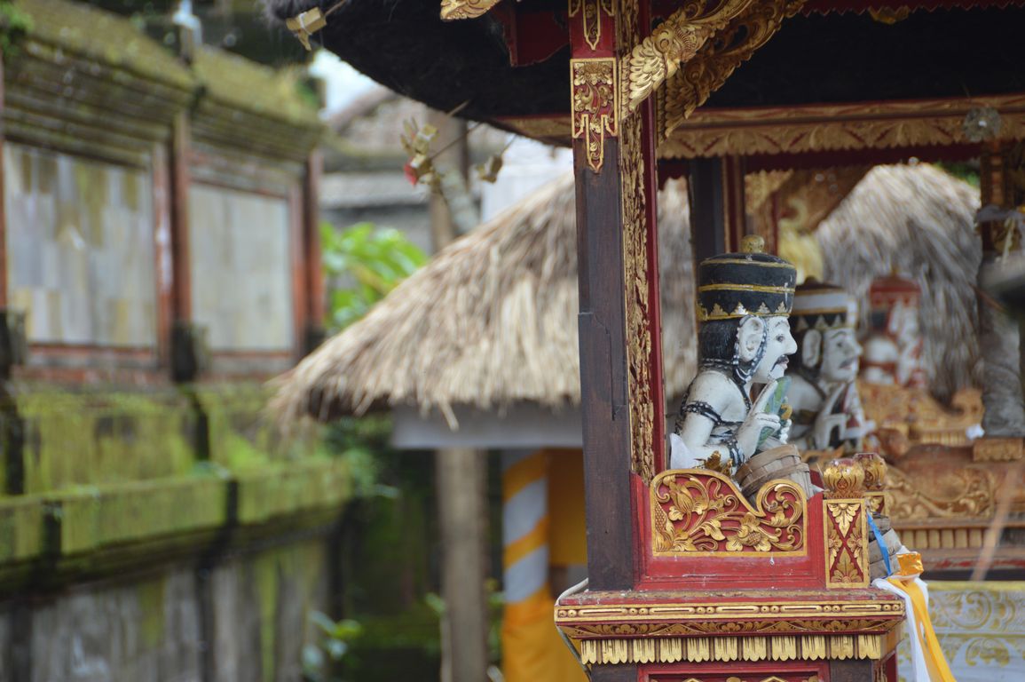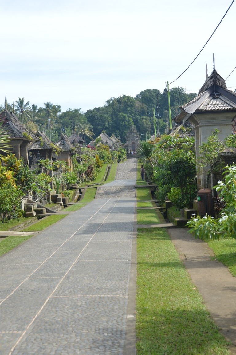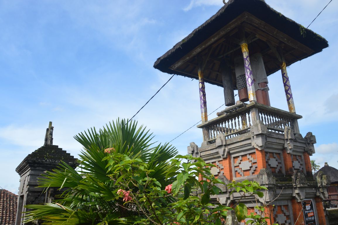 Première visite: celle de Penglipuran, un village traditionnel de campagne, constitué d’un alignement de maisons balinaises traditionnelles, avec chacune leur temple bien entendu, et dont l’orientation suit les règles du Feng-Shui: temple orienté vers les montagne, maisons divisées en pieds, corps et têtes,… Ici, pendant que les habitants travaillent, pas besoin de fermer la maison à clé: les chiens montent la garde devant les portails ! Un endroit de dépaysement total.