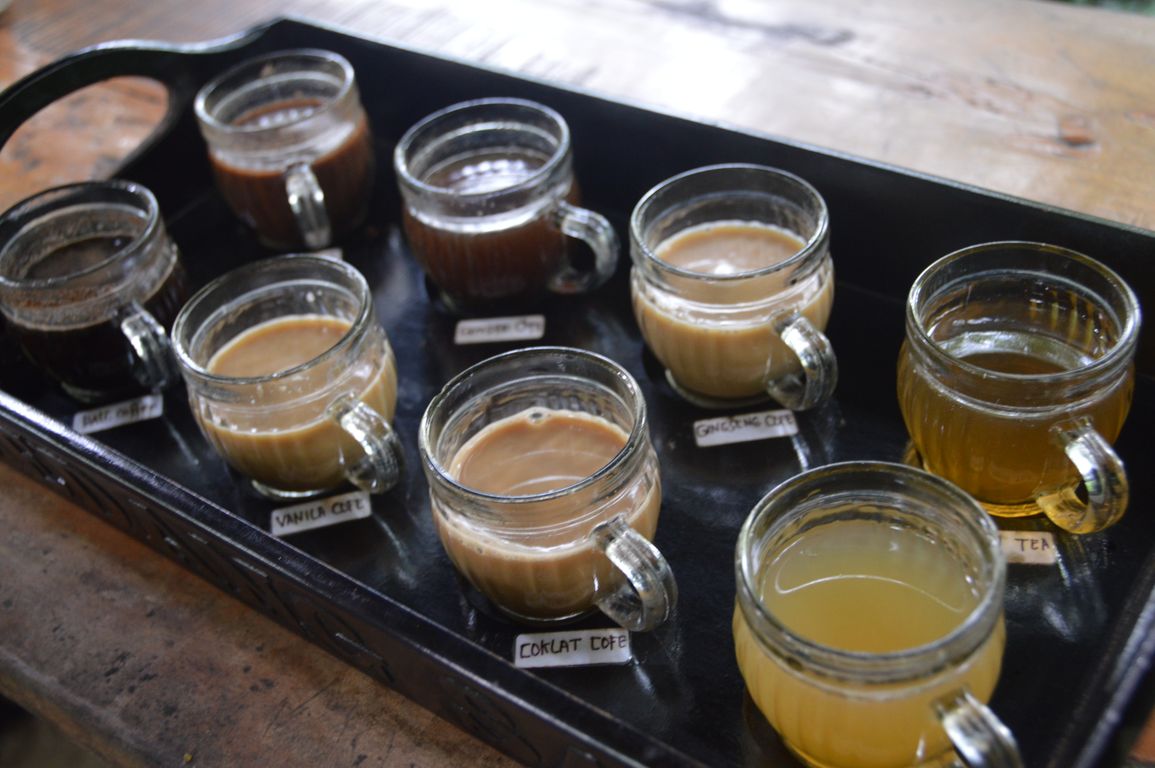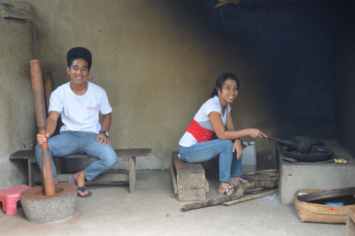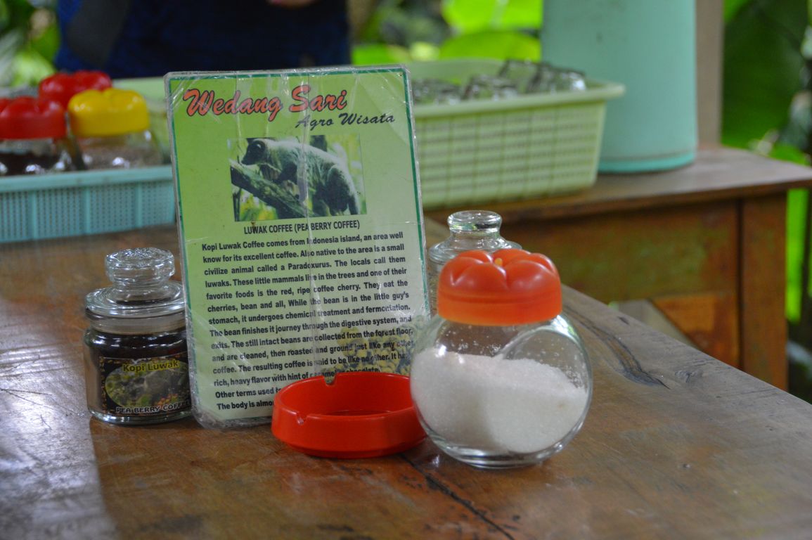 Le ventre bien rempli, nous continuons la journée (toujours aussi ensoleillée, c’est une blague cette saison des pluies ou quoi? ;) ) par une visite de producteurs locaux de cacao et de café. On y trouve notamment un des cafés les plus chers au monde, le Luwak, dont la production demande « l’action digestive » de mangoustes, qui donnent aux graines un goût particulier et très recherché. Visite et dégustation convaincante, car nous sortons de là avec du café au ginseng et du thé au gingembre (« bons contre les rhumes avec le mauvais temps que vous avez en Europe! »). Nous en profitons pour nous balader dans le jardin, qui regroupe la plupart des fruits et autres plantes de l’île: différentes sortes de café, mais aussi cornichon, papaye, arbre à cannelle,… On dirait que tous les fruits du monde sont capables de pousser dans ce petit paradis terrestre ! :)