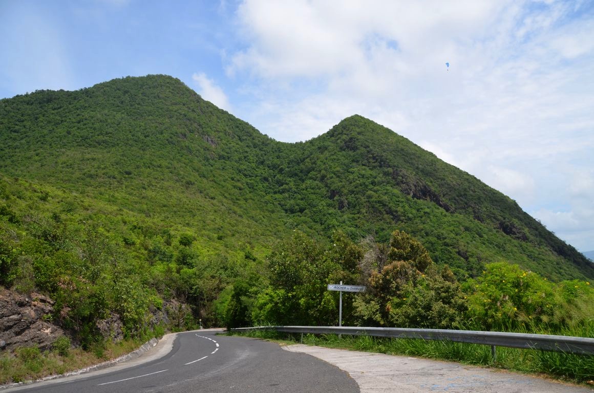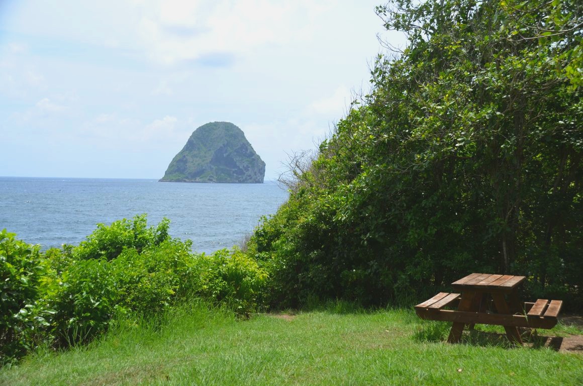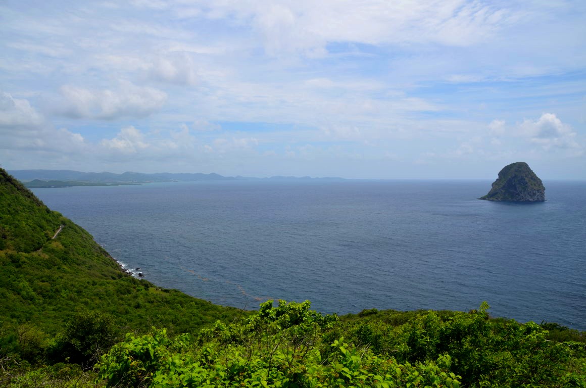 Je continue ma route et j’arrive à un magnifique point de vue (à Morne Larcher) sur le Rocher du Diamant, un petit rocher inhabité qui fut occupé au 19ème siècle par les troupes françaises et britanniques qui se faisaient la guerre dans les Antilles. Le soleil est magnifique aujourd’hui et je resterais bien restée des heures à contempler cette vue !