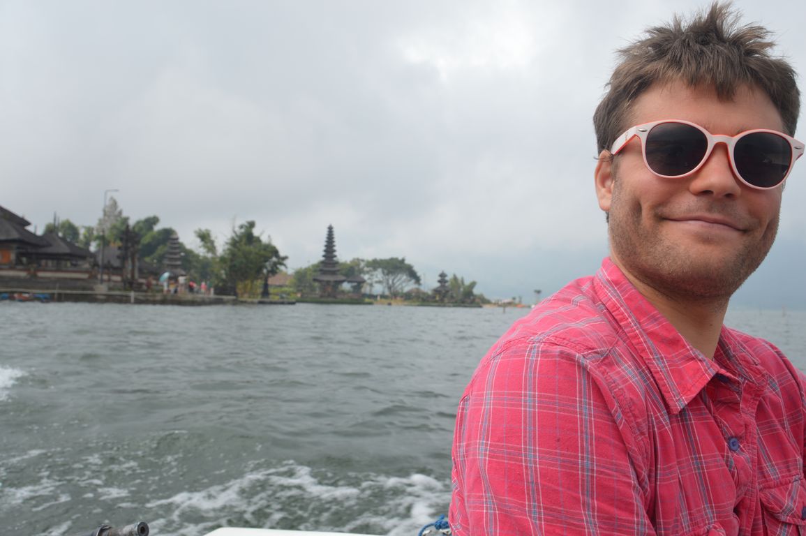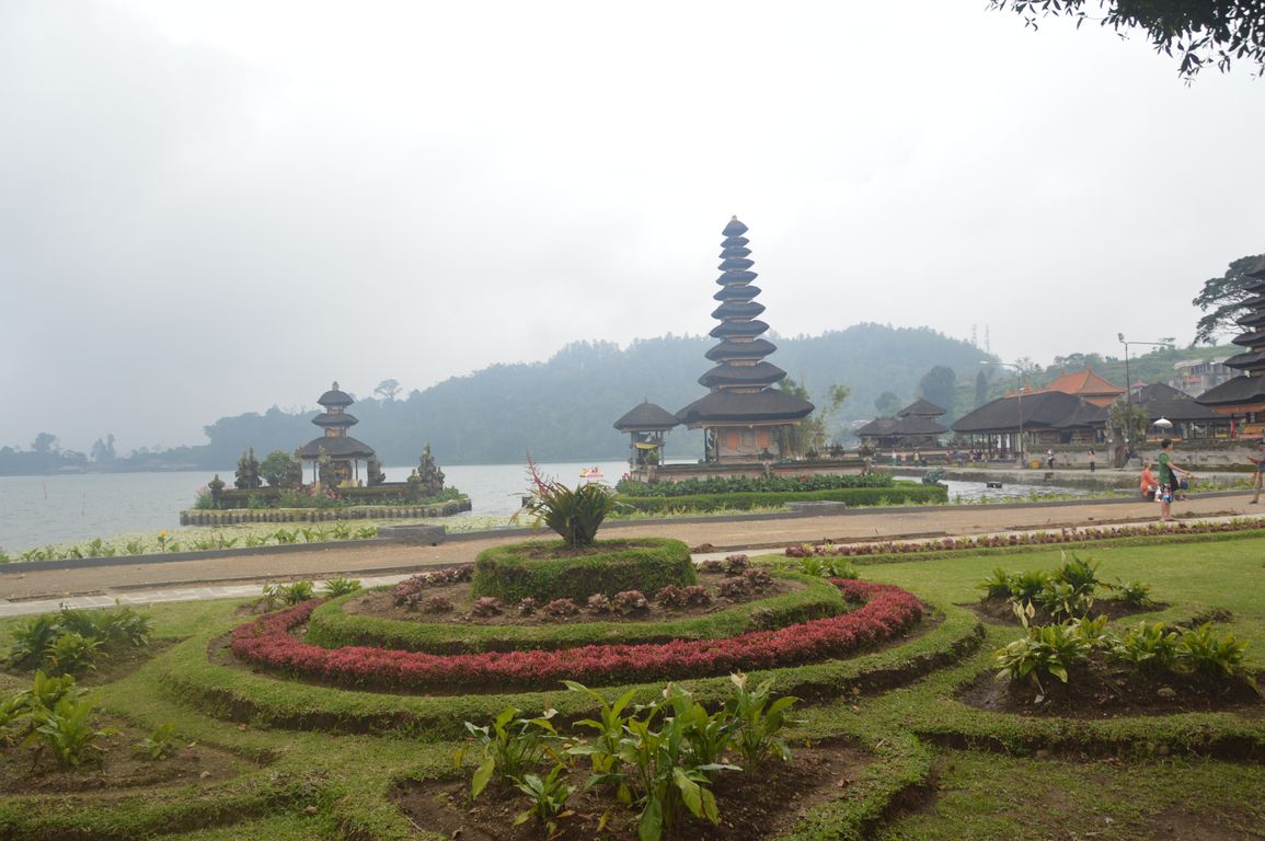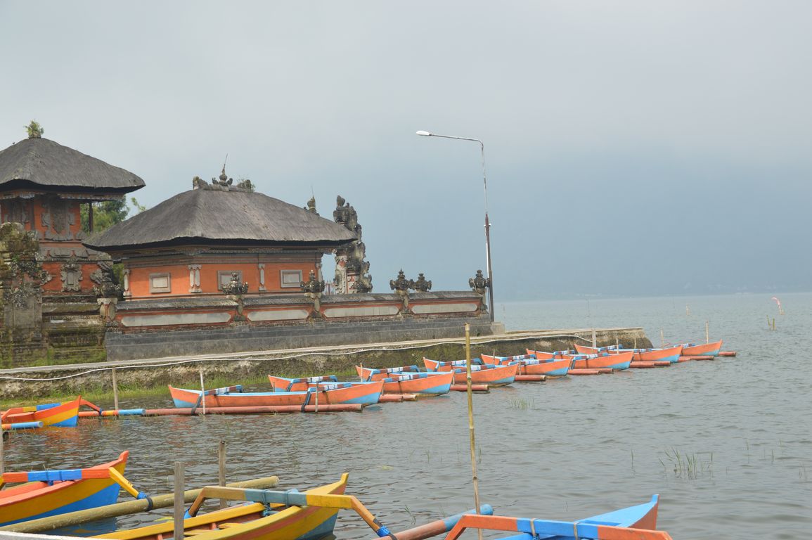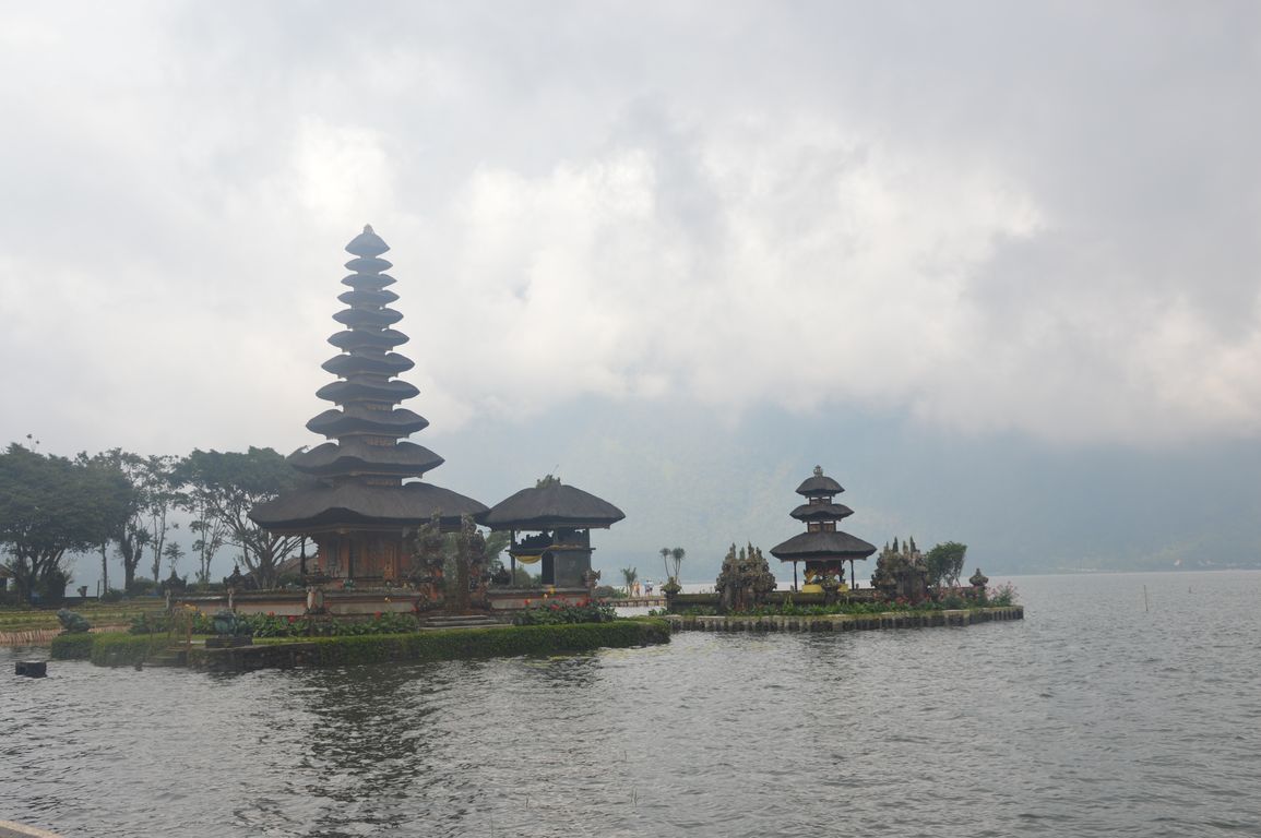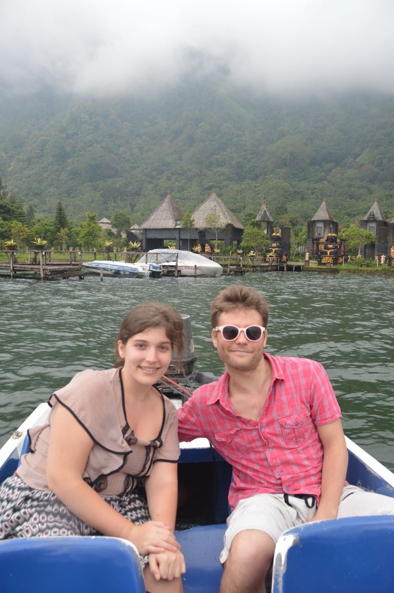 Plus nous nous enfonçons dans les montagnes, plus le temps se fait brumeux (on se croirait en Inde… :) ). Nous arrivons au Lac Bratan, au bord duquel se trouve le temple d’Ulun Danu. La brume recouvrant une bonne partie du paysage procure une sensation vraiment particulière, on se sent un peu perdu au milieu de nulle part. Encore plus lorsque nous embarquons dans un petit bateau à moteur pour faire le tour du lac… Le bateau, dépassant de quelques centimètres de l’eau seulement, n’est pas des plus rassurants au premier abord. D’autant plus que côté vitesse, le pilote se lâche ! Enfin, le vent fait un bien fou et la vue est vraiment magnifique depuis le milieu du lac…