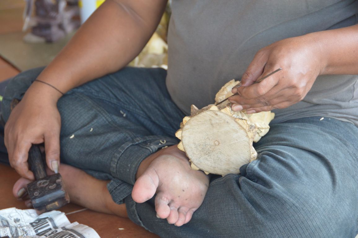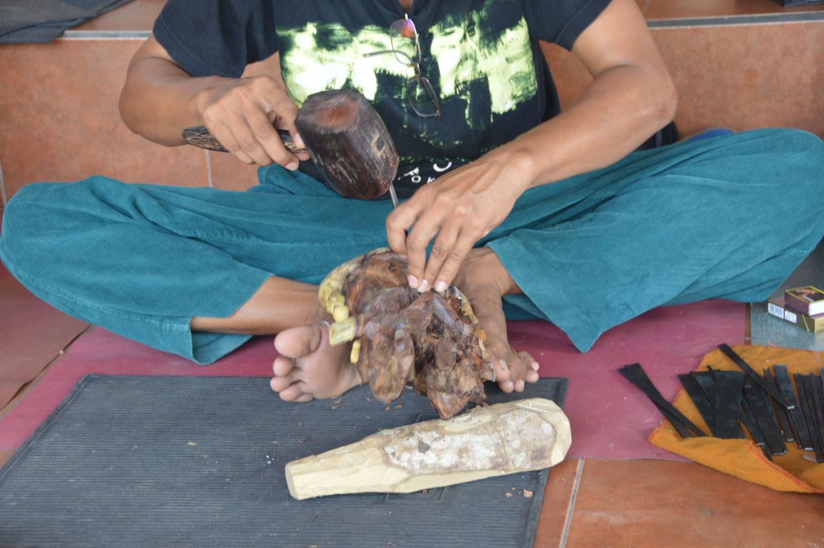 Après un petit déj indonésien au Kori Ubud Resort, nous partons donc visiter les artisans d’Ubud. Il n’y a pas vraiment d’école pour les artisans, le savoir se transmet de père en fils (ou de mère en fille). Difficile d’avoir un bon prix par contre avec notre « tête de blanc » (on commence à s’habituer)…