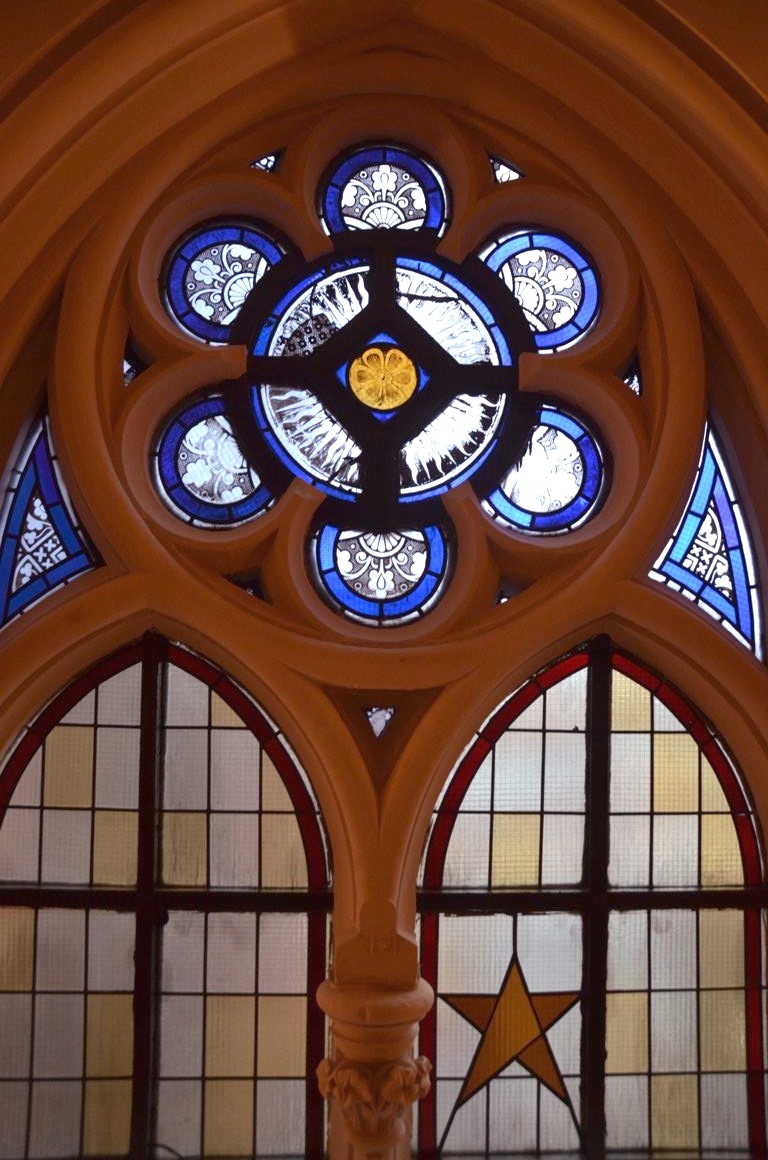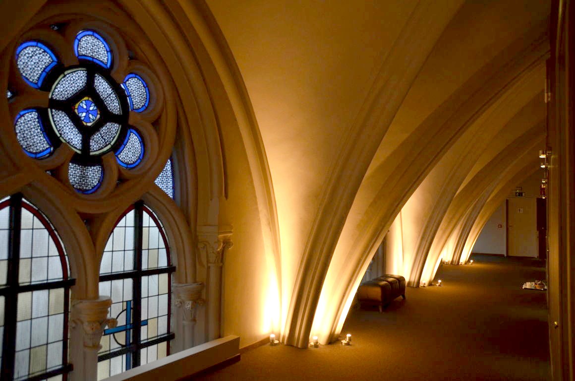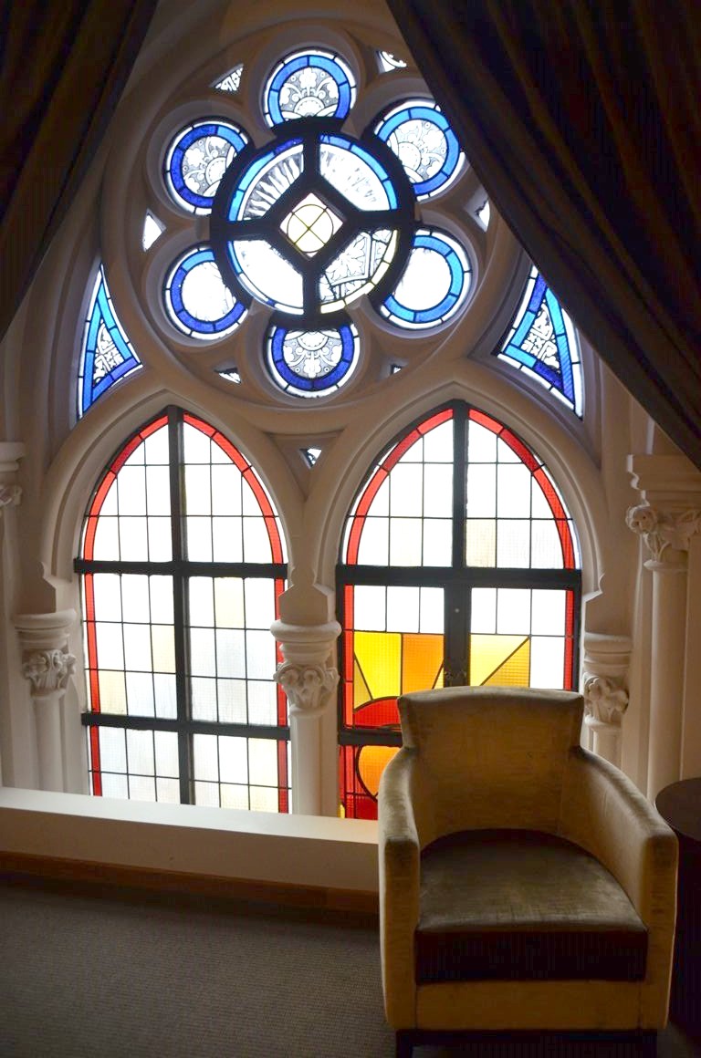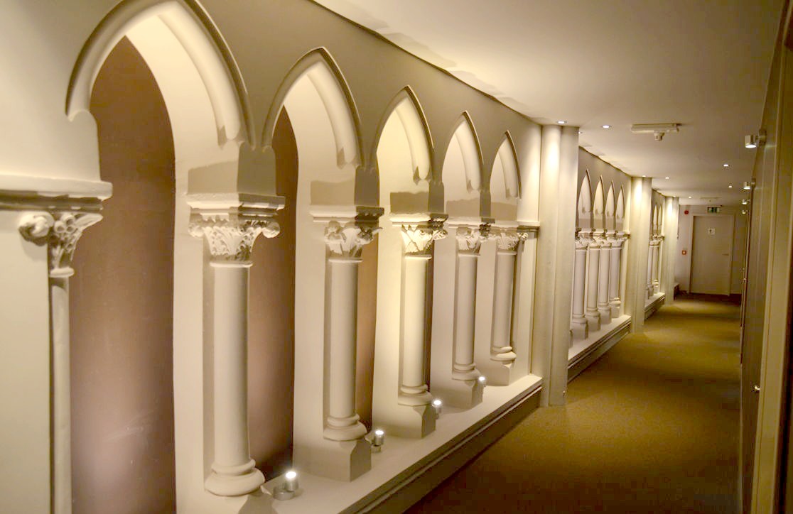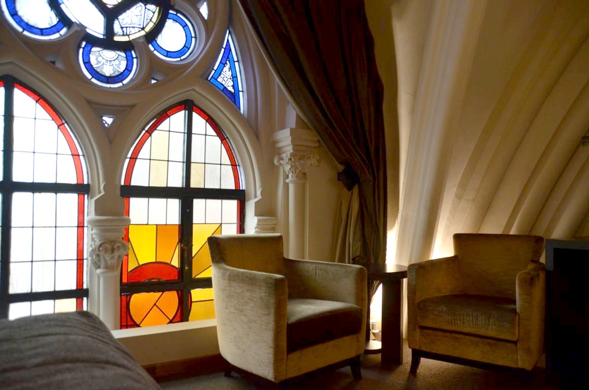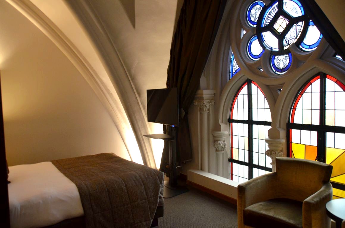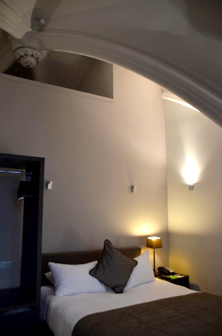 L’hôtel a voulu conserver cet héritage architectural exceptionnel, et c’est plutôt réussi : colonnes dès la réception, voûtes en arc brisé dans les couloirs et dans les chambres, vitraux… Pas de toute, nous sommes bien dans une ancienne église !