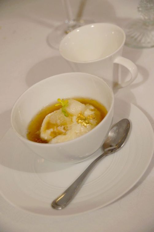 Foie gras de canard poché au consommé de bonite et canette, ile flottante de navet boule d’or, mochi frit, lemonquat (alors là, ce fut la claque absolue !)