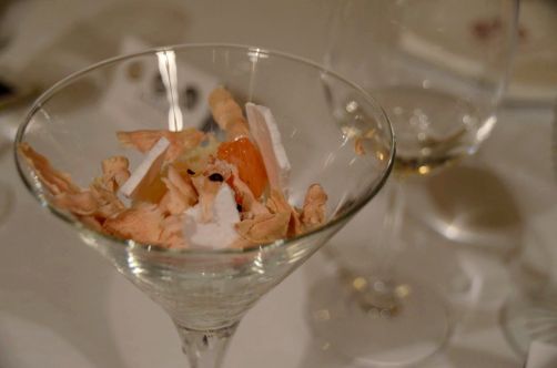 Granité de nashi aux agrumes, meringue légère parfumée aux fleurs de Sakura, copeaux de foie gras d’oie.