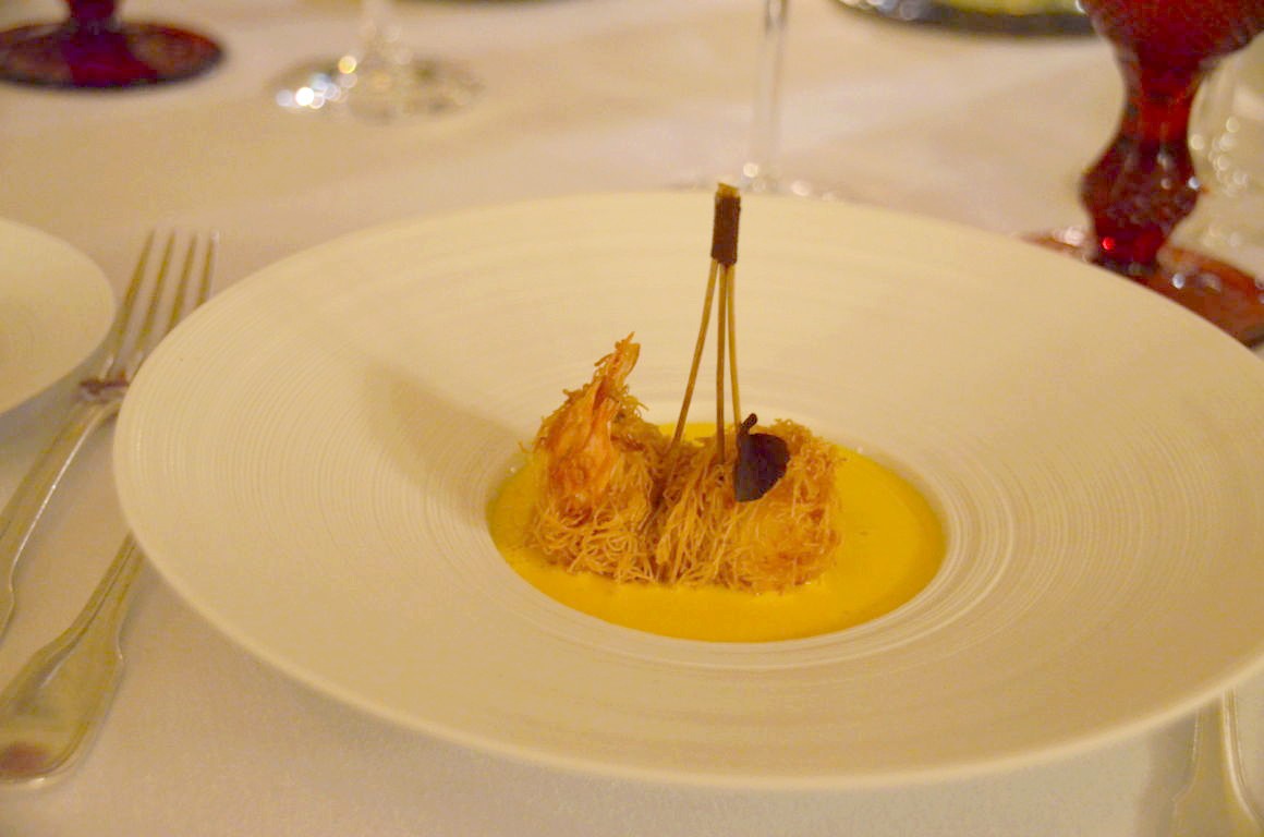 Crème de potimarron, langoustine du Finistère en kadaïf, écume de truffe