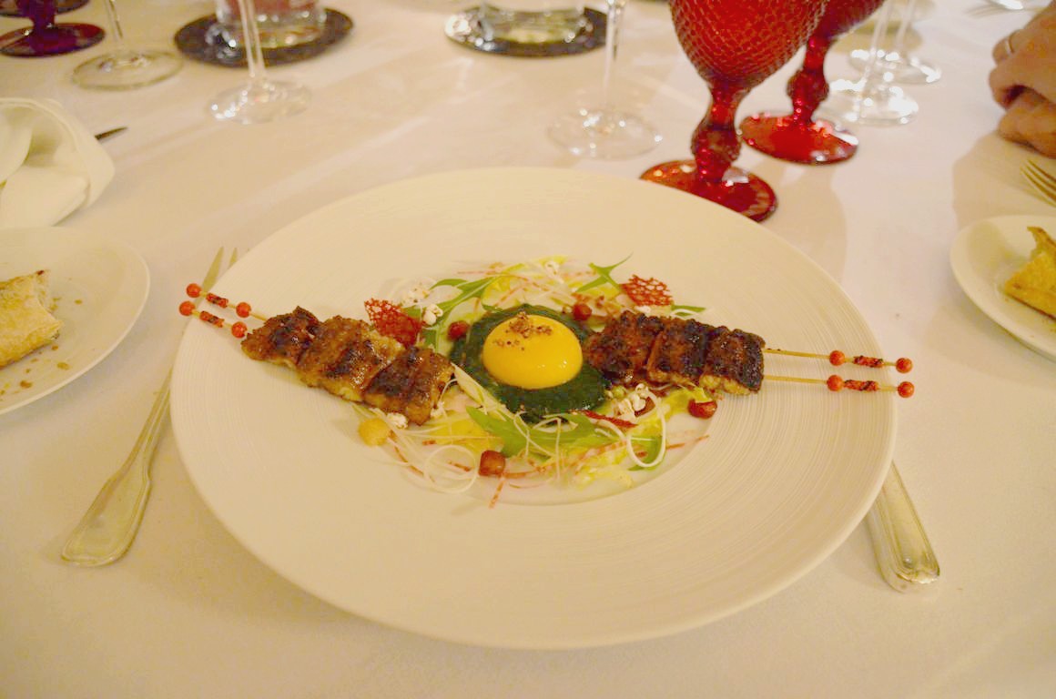 Anguille vivante laquée au Saké, salade de betterave, pissenlit, coulis de mizuna, jaune d’oeuf confit minute