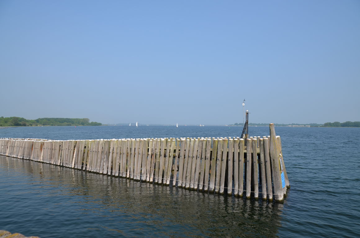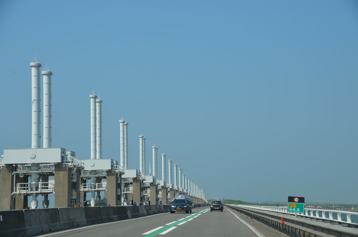 Nous continuons ensuite notre visite de Zélande en voiture, direction le « Oosterscheldekering« , le Barrage de l’Escaut Oriental, avec un arrêt en chemin sur la grande plage de Banjaardstrand, d’où on peut déjà apercevoir au loin le fameux barrage, mastodonte du Plan Delta, l’énorme système anti-inondations maritimes déployé depuis les années 80 aux Pays-Bas. Vraiment impressionnant !