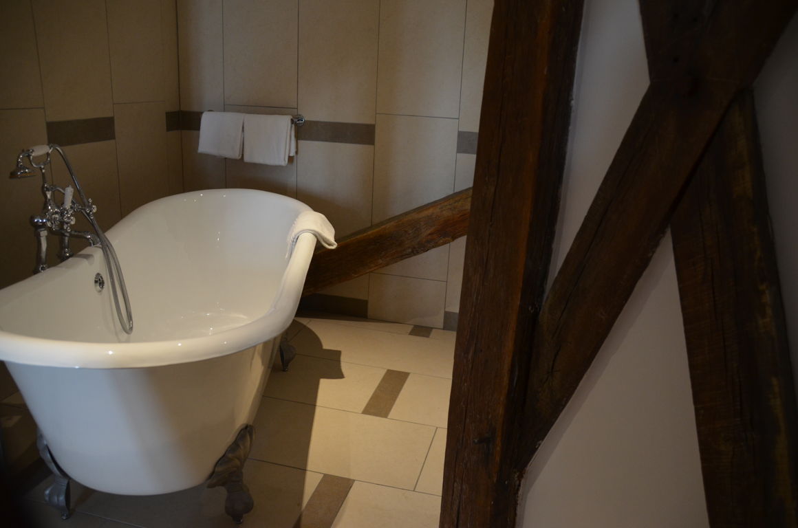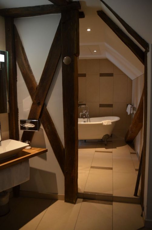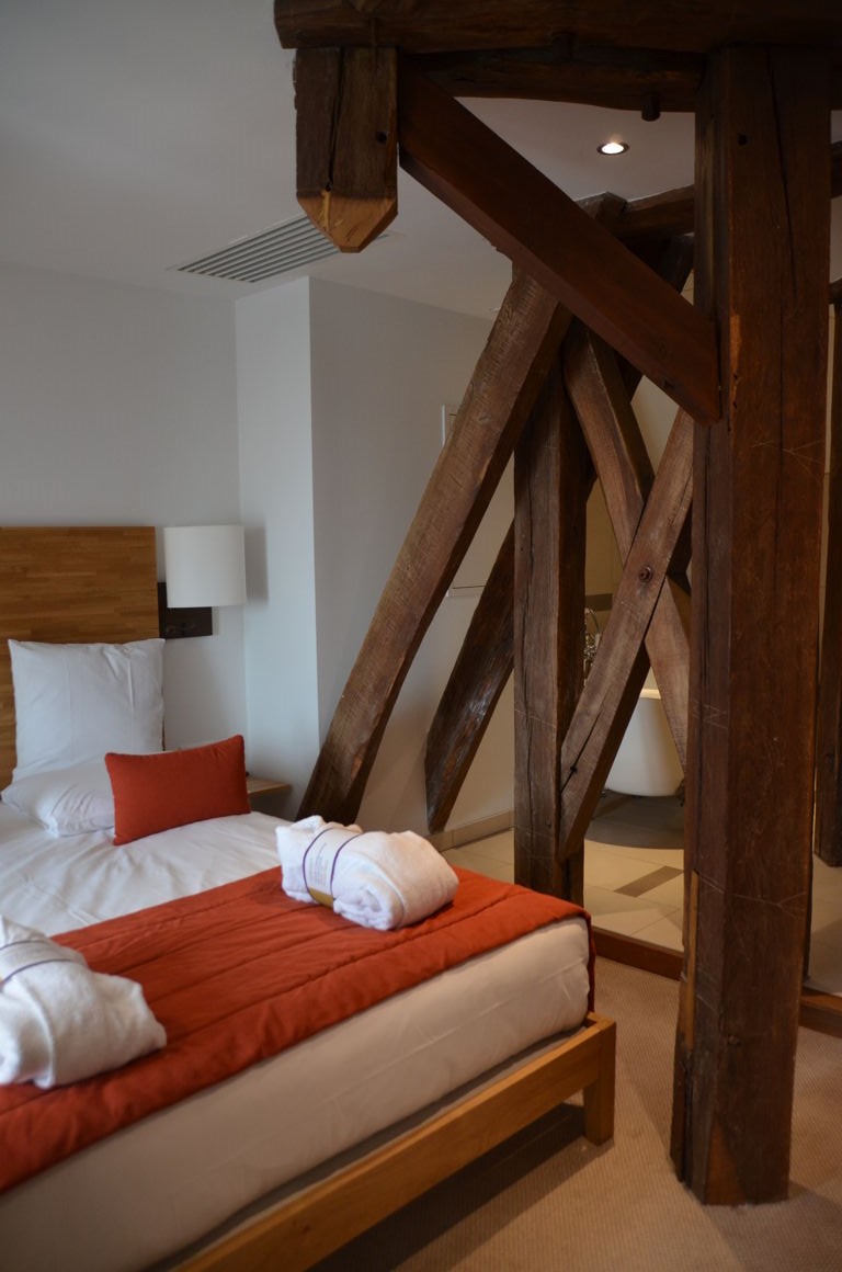 Ma chambre est gigantesque et pleine de charme avec ses charpentes apparentes et sa salle de bain ouverte.