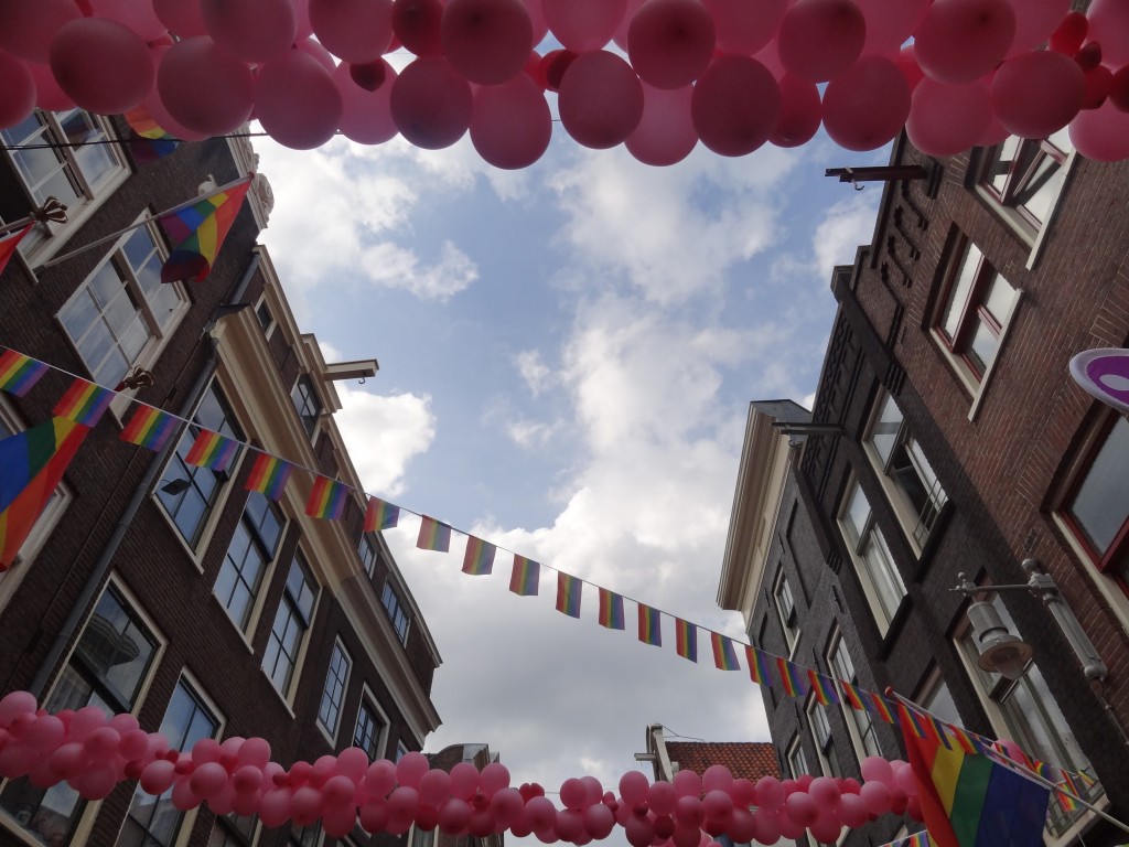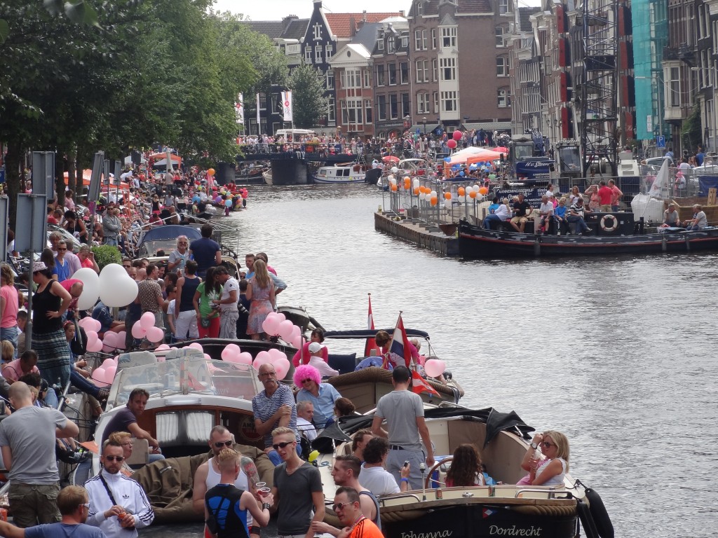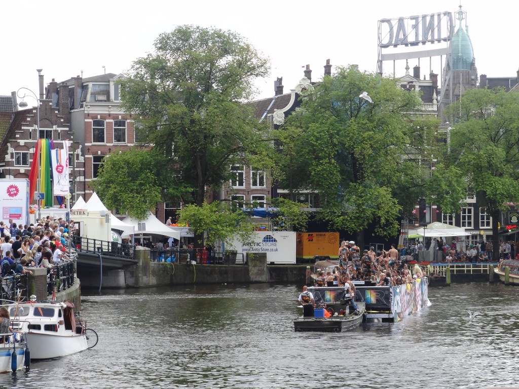 Enfin bref, j’y suis donc retournée samedi passé, pour une petite journée entre filles… Ce que je ne savais pas, c’était que ce weekend avait lieu la Gay Pride! On a donc eu droit à toutes sortes de spécimens divers et variés en rue, la plupart vêtus (si on peut dire) partiellement ou totalement en rose, paillettes et compagnie! Et tout ce beau people défile donc joyeusement dans les canaux d’Amsterdam dans des bateaux assortis à leurs tenues … Bref, on avait bien choisi notre jour! ;-)