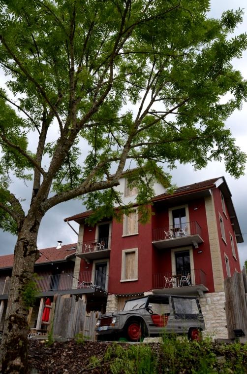 Après environs 8 heures de route (sans péages !) depuis la Belgique, nous arrivons sous un beau ciel bleu à notre première étape, la Maison d’hôtes La Tour du Coq Doré, aux Granges Narboz, dans le nord du Massif du Jura.