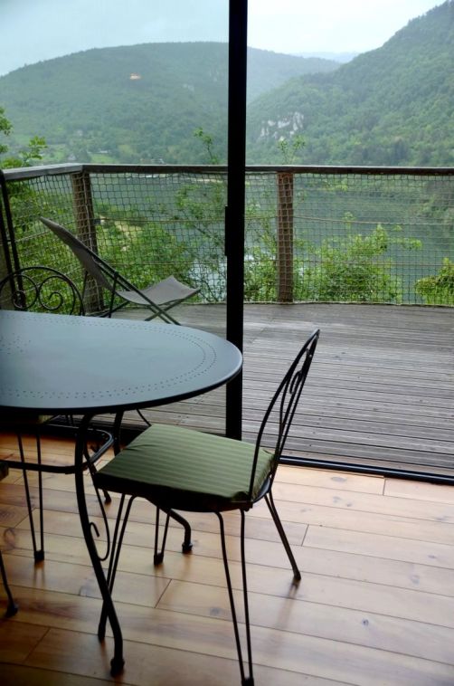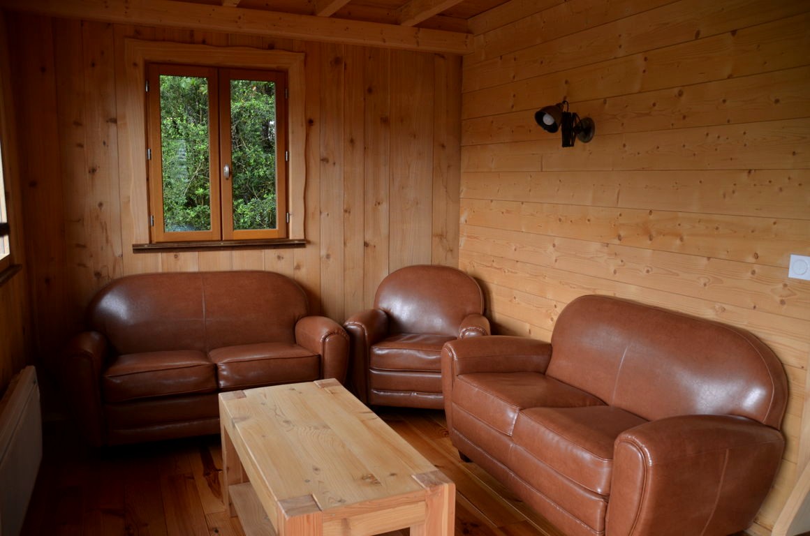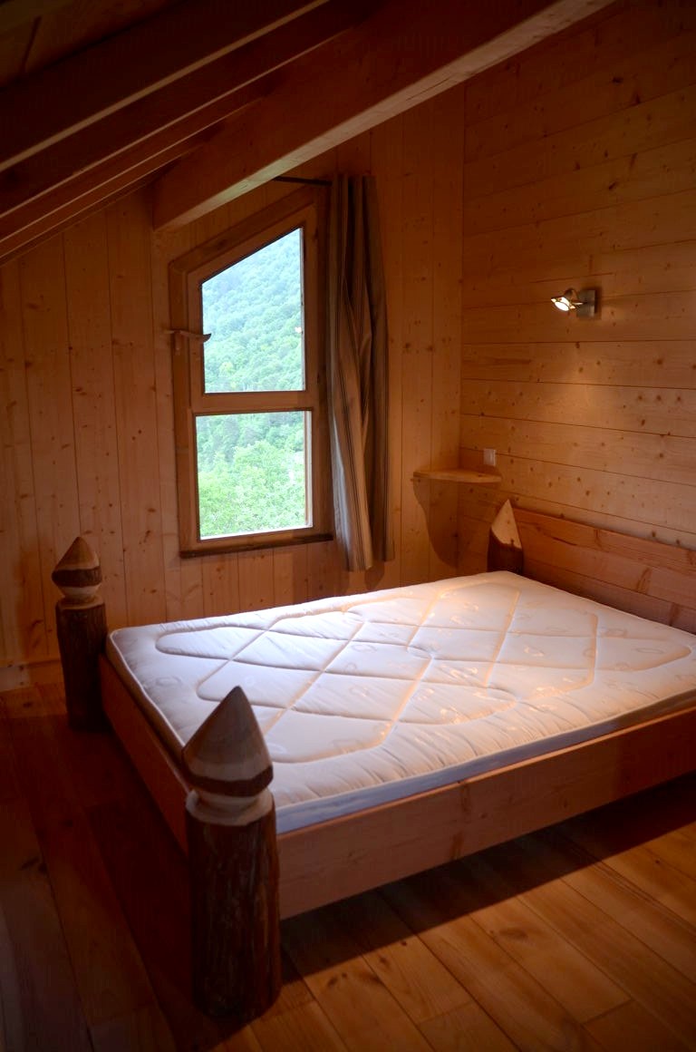 Notre lodge en bois très spacieuse (avec une cuisine équipée, une salle de douche et un grand espace de vie au rez-de-chaussée et deux chambres à l’étage), située au milieu des arbres, offre une belle vue sur la rivière Ain et l’île Chambod depuis sa grande terrasse. Un endroit très calme, et une bonne base pour un séjour 100% nature !