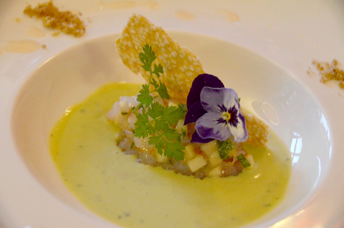 Nous passons ensuite à la première entrée, les crevettes d’Argentine en tartare au couteau, accompagnées de petits pois, oignons fruits et huile de carcasses. Un plat tout en fraîcheur, idéal en début de repas.