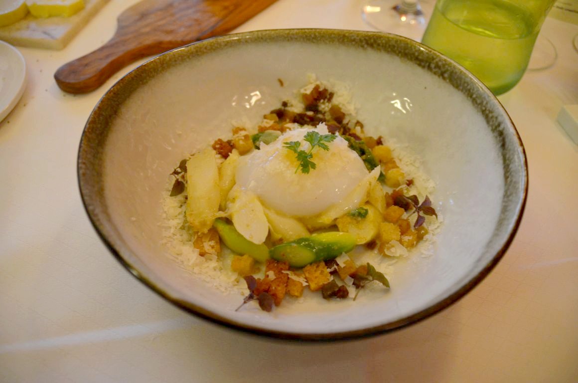 Nous allons crescendo dans le plaisir culinaire, car ce sera la dernière entrée qui sera mon coup de coeur: l’oeuf du poulailler, arperges et carbonara. Une belle assiette gourmande, tout en simplicité mais riche en goût: un délice !