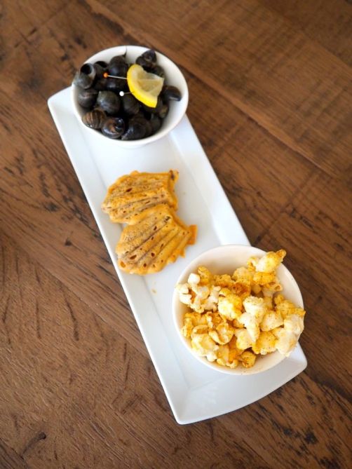 Nous avons commencé par quelques mises en bouche : popcorn au épices, les traditionnels bigorneaux de Bretagne, madeleines maison, suivis par quelques délicieuses bouchées, dont un très original cromesquis de boeuf béarnaise.