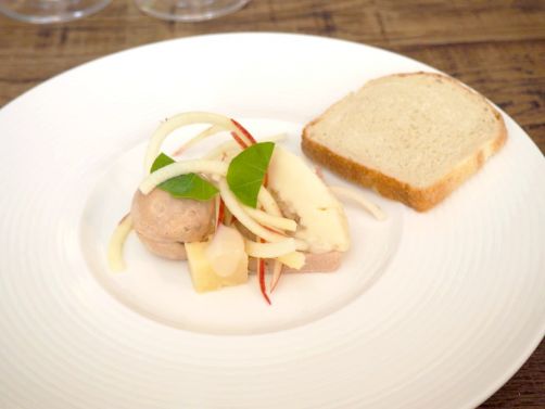Nous commençons le repas par quelques mises en bouche : des cônes de maquereau et quelques bulots, suivis d’un vitello tonnato, cromeski de petit gris, et asperges à la flamande revisitées, et enfin d’un velouté glacé aux asperges belges, accompagné d’une glace de saumon fumé et d’herbes du jardin. Une belle entrée en la matière !