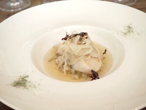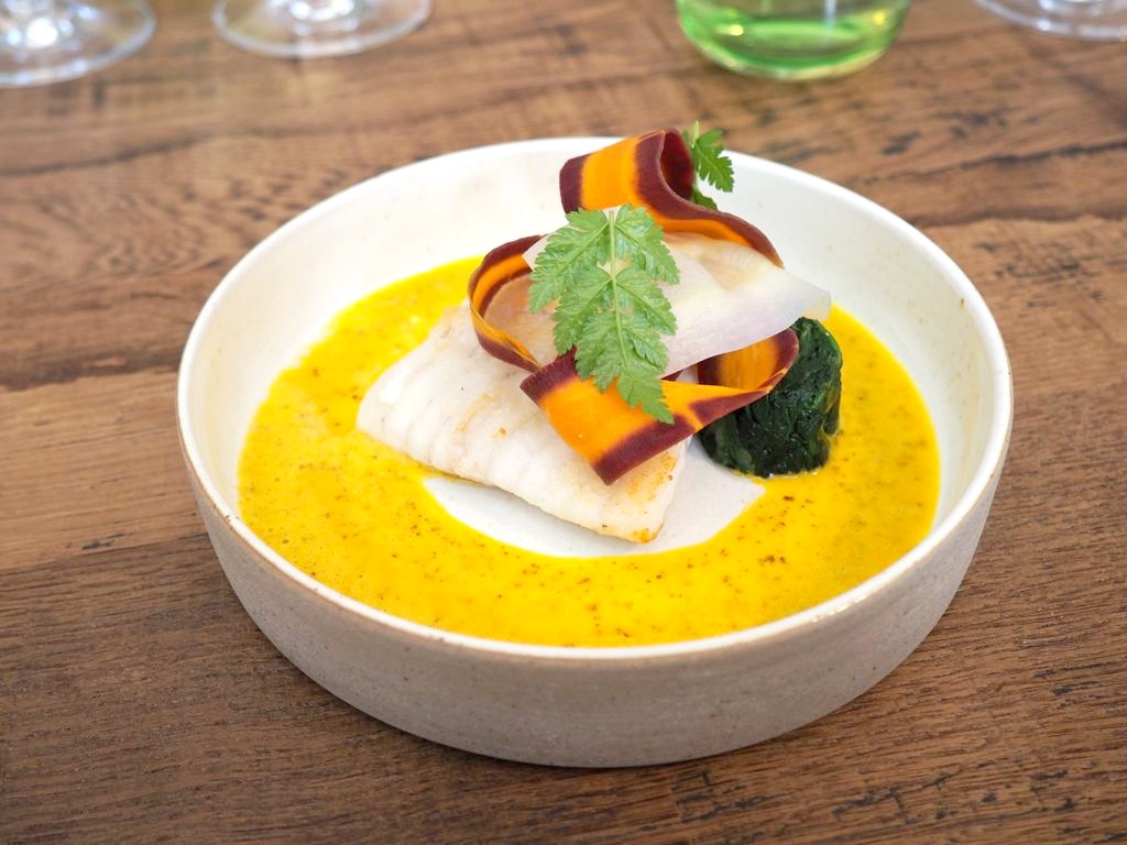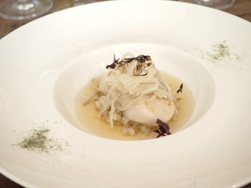 Nous avons poursuivi avec deux plats de poissons, tout d’abord le turbot sauvage, accompagné de carottes, moutarde et épinards (un délice, cuisson et assaisonnements parfaits !), puis la Saint-Jacques accompagnée de pickle de chou et bouillon dashi, un joli plat avec quelques notes exotiques très sympas.