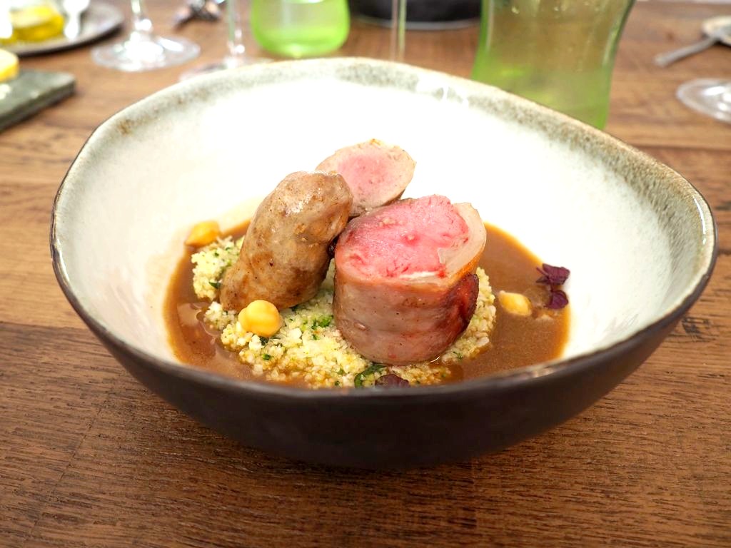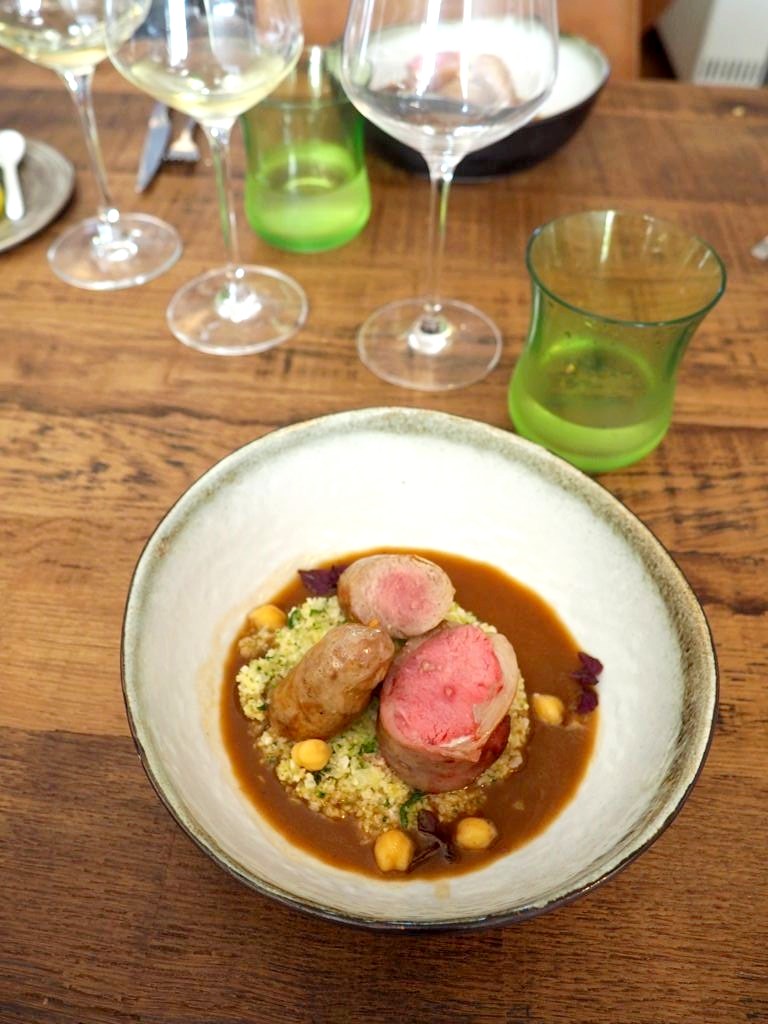 Ensuite, et heureusement que nous avions encore de la place, voici mon coup de coeur du jour, le dos d’agneau et saucisse d’agneau maison (ça, mes amis, ça vaut le déplacement !), choux, coriandre et jus oriental.