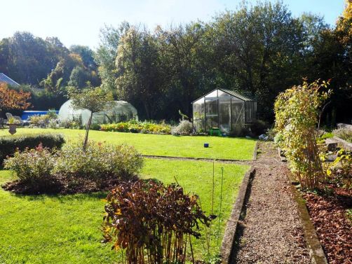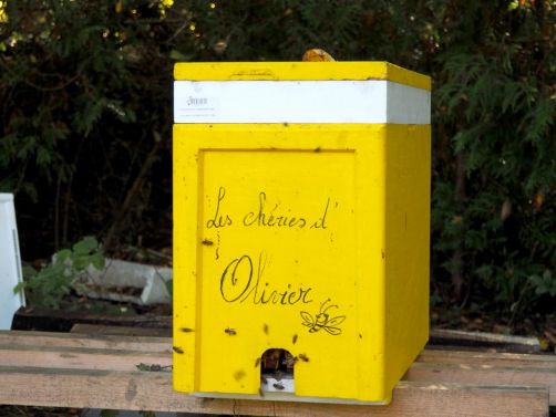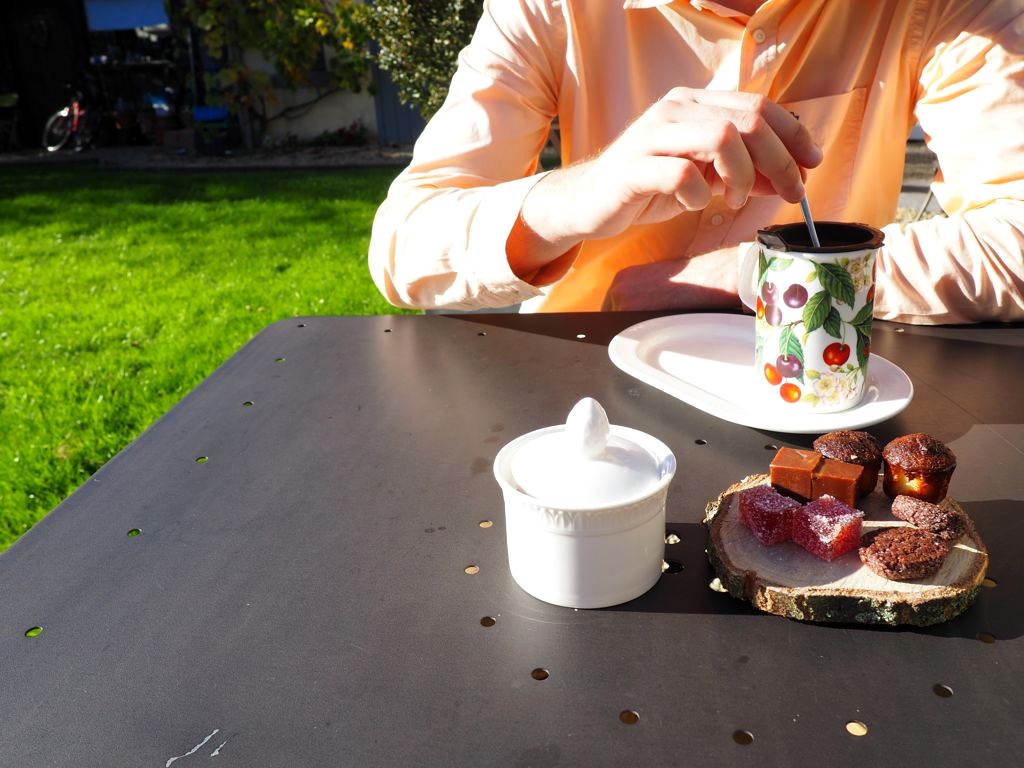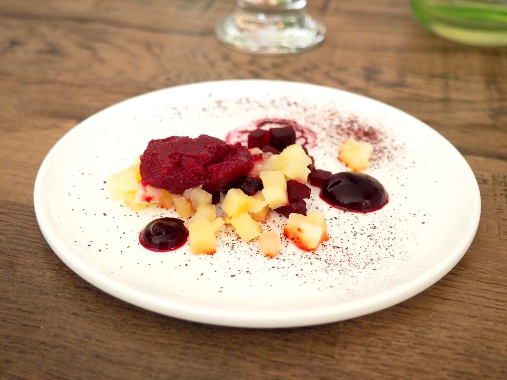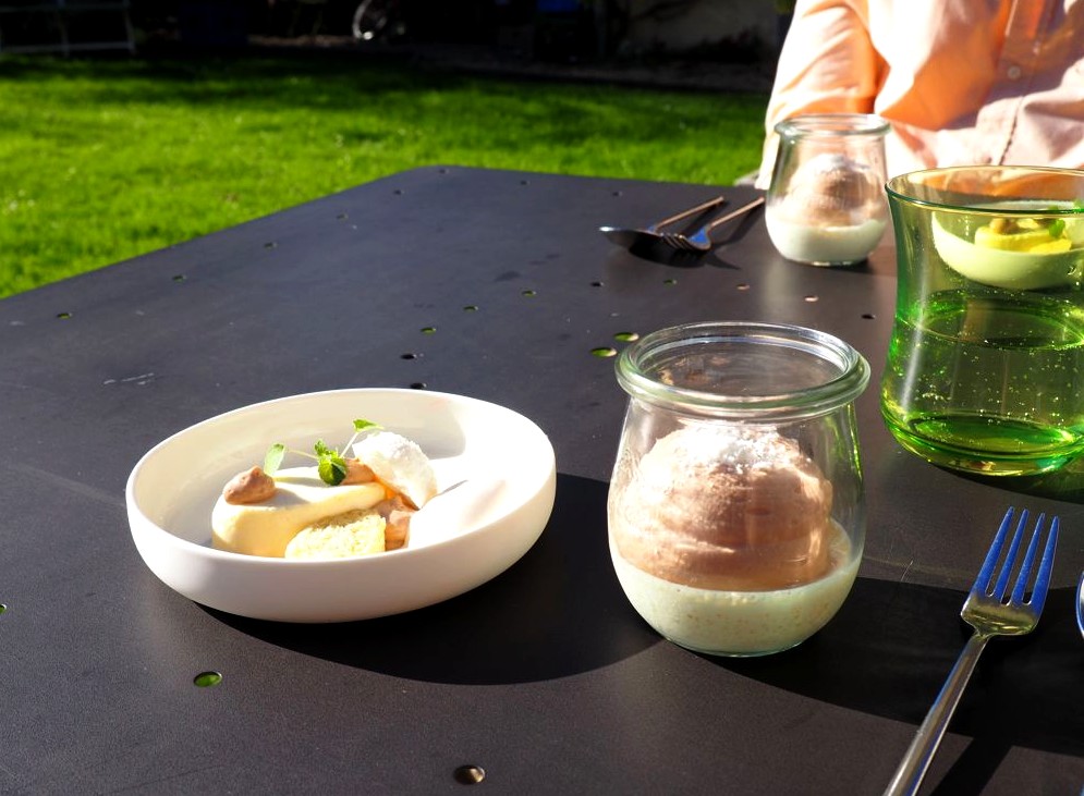 Après un petit pré-dessert pomme betterave, le soleil étant toujours là nous finissons le repas en terrasse, et quel bonheur que ce petit été indien ! Nous en profitons pour faire un petit tour dans le jardin (et rencontrons les « chéries » du chef: ses abeilles !), avant de passer au dessert chocolat, coco et amandes.