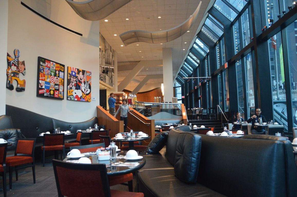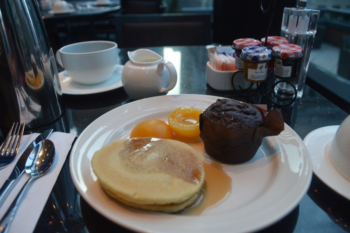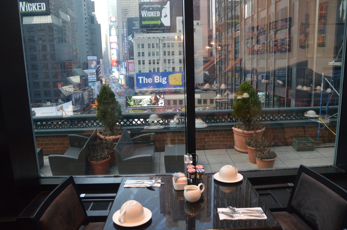 Aujourd’hui, le réveil a bien sonné et on a donc pu découvrir le petit-déj avec vue sur Times Square du Novotel. Au programme dans mon assiette : des pancakes au sirop d’érable, des muffins (il n’y a qu’aux Etats-Unis qu’on en mange des pareils…), et un bagel bien rempli pour être bien calés jusqu’au lunch !