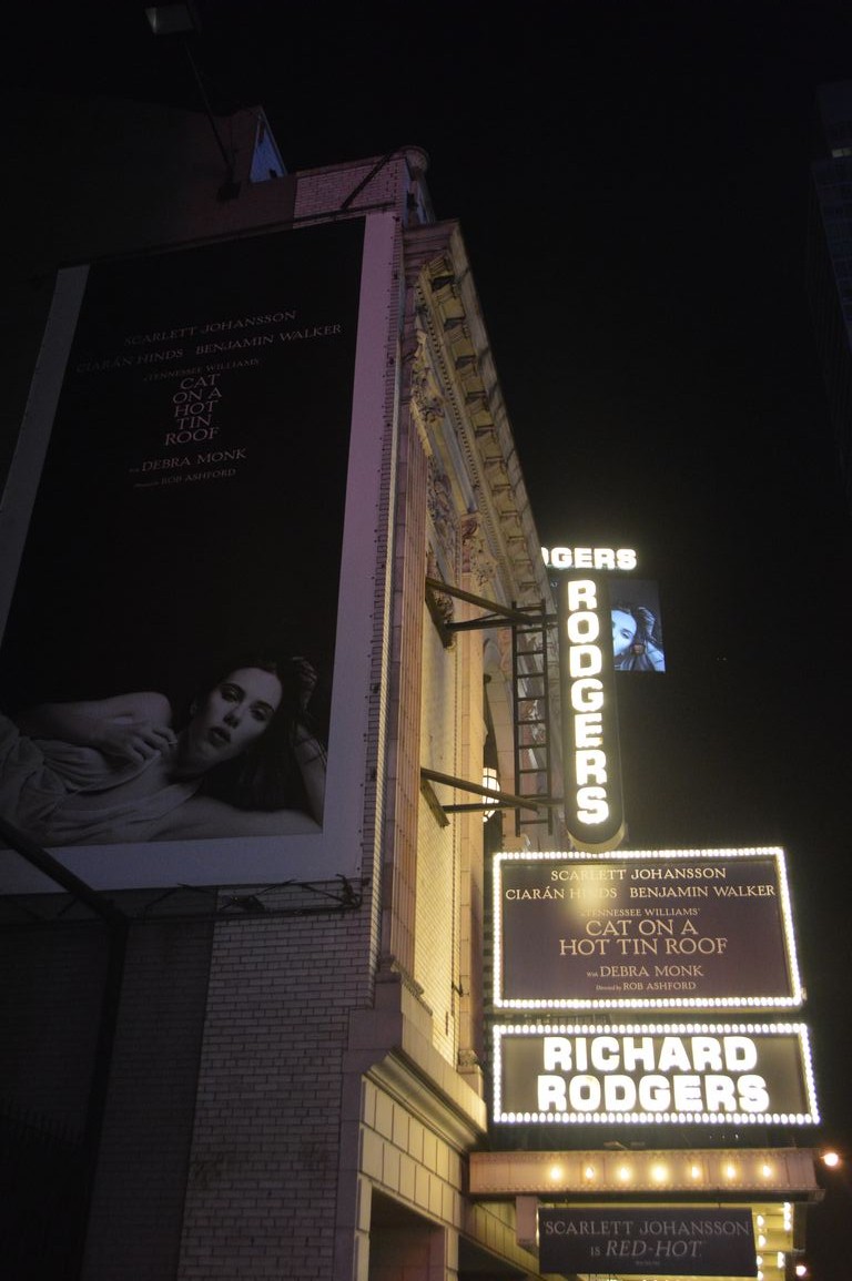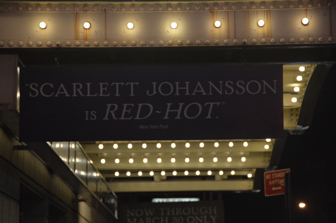 Lors de notre première soirée à Times Square, on avait repéré que Scarlett Johansson jouait dans une des pièces à l’affiche à Broadway, « Cat on a Hot Tin Roof ». Comme Fred et moi on est des grands fans, même après une réflexion due au prix des tickets (chéros même à 50% pour le jour même…), on a décidé de passer la soirée en compagnie de Scarlett au Richard Rodgers Theatre (soirée très privée hélas, car les photos sont interdites dans les théâtres par la loi de NY… sérieux tout ça!).