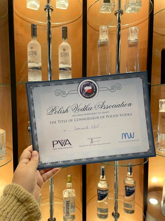 La visite se termine bien sur par une dégustation de vodkas. C’est la première fois que je faisais une vraie dégustation de vodka et j’ai trouvé ça très intéressant. J’ai notamment appris que je préfèrais la vodka à la pomme de terre, qui est la plus douce. A la fin, on reçois même un petit diplôme de connaisseur de vodka polonaise !