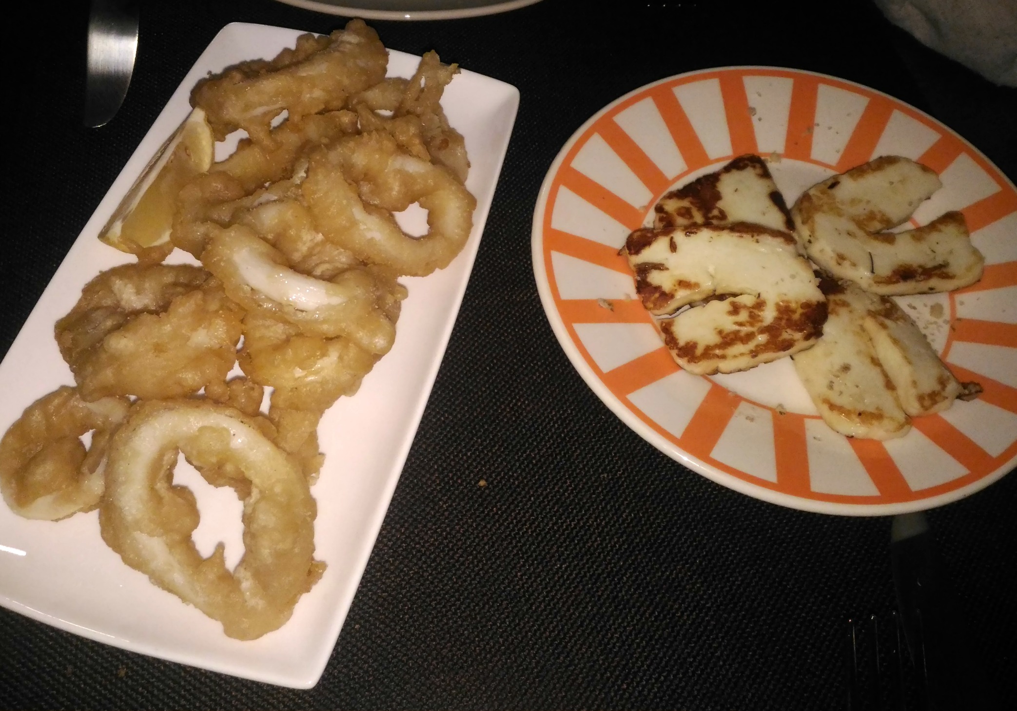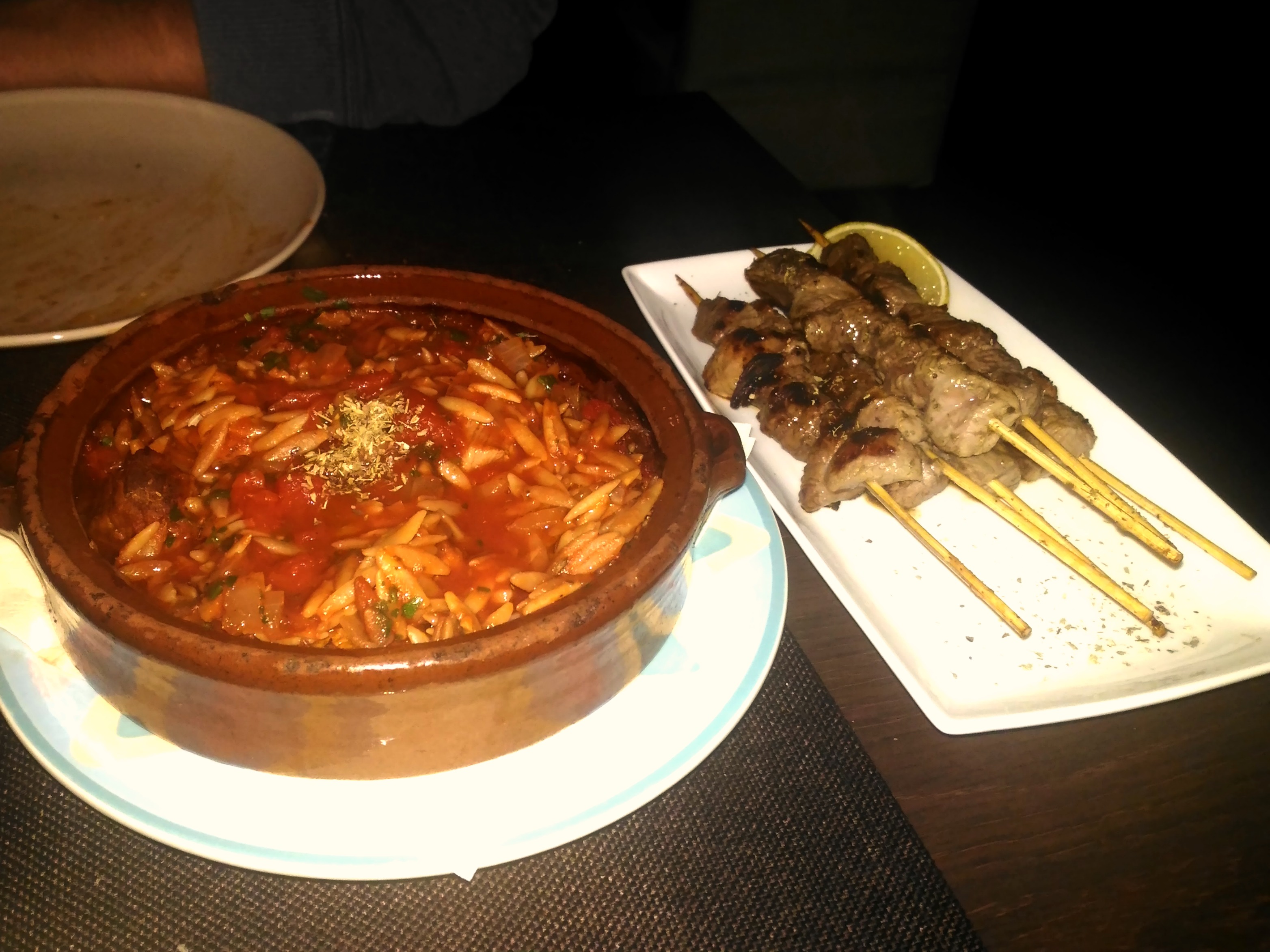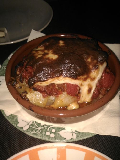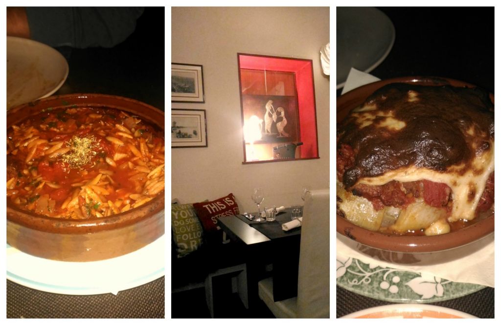 Sur recommandation de Monsieur Rigolet qui estime que prendre 3 plats par personne est plus que suffisant, nous nous sommes laissés tenter par l’assortiment de 8 mousses au choix (tarama, tsatsiki, feta aromatisée à la truffe blanche, Skordalia – purée aux pommes de terre et à l’ail,… pour 9€, une vraie tuerie que je vous recommande chaudement !), les calamars frits, le fromage halloumi grillé, les Souvlakia (petites brochettes d’agneau), l’Imam Baïldy (aubergine farcie aux oignons et feta gratinée, haché et sauce tomatée) et le Youvetsi de boeuf, mon plat grec préféré (pâtes grecques, dés de boeuf, sauce tomatée) qui me rappelle toujours les vacances en Grèce.