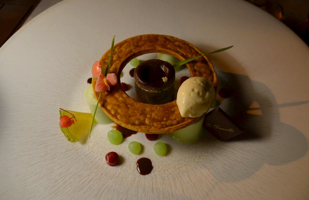 Enfin, après un petit prélude au dessert (sorbets figue-framboise), nous finissons avec une variation sucrée au chocolat et aux fruits.