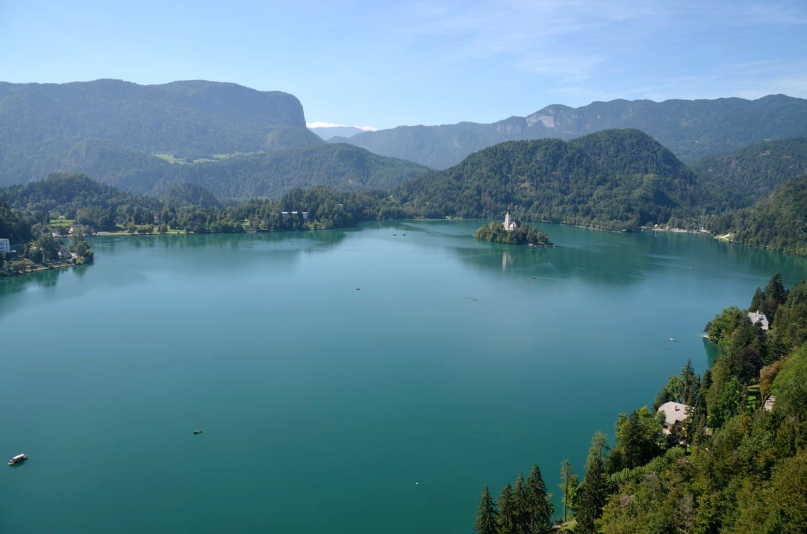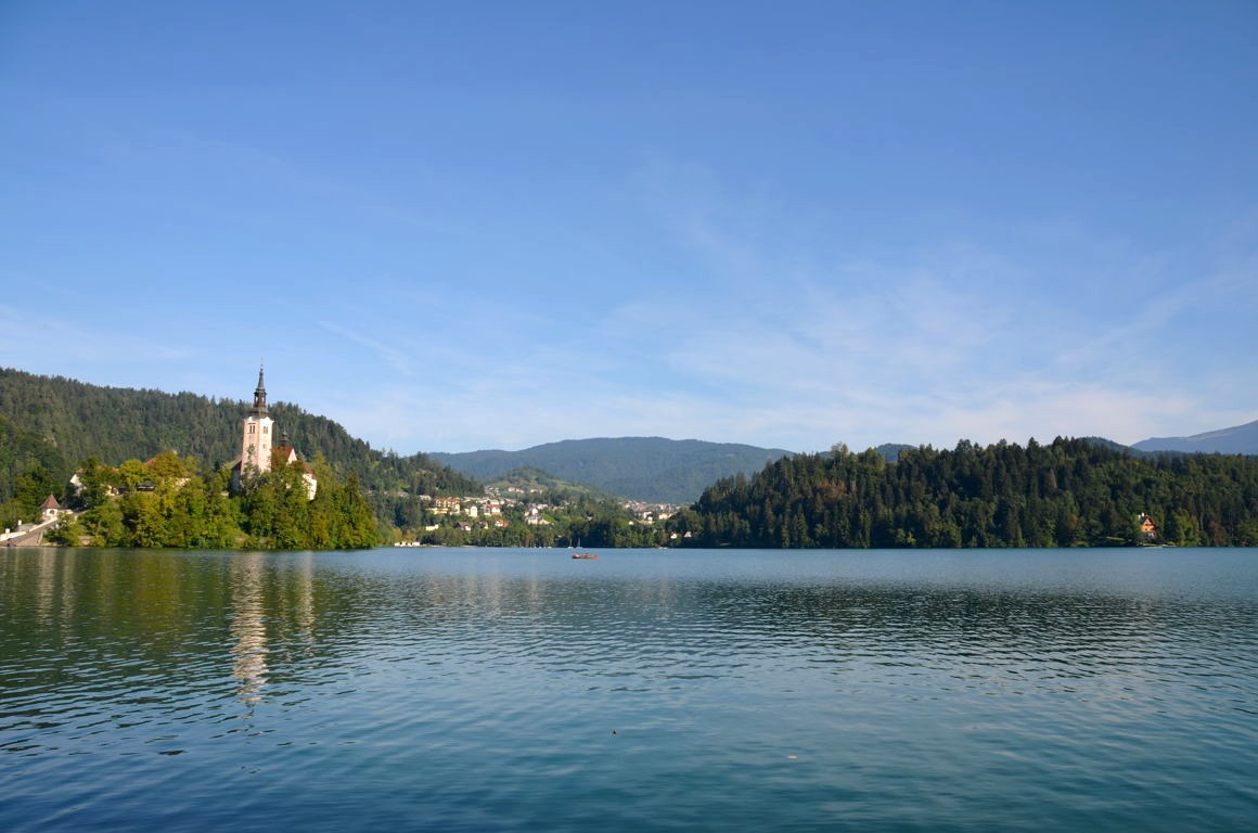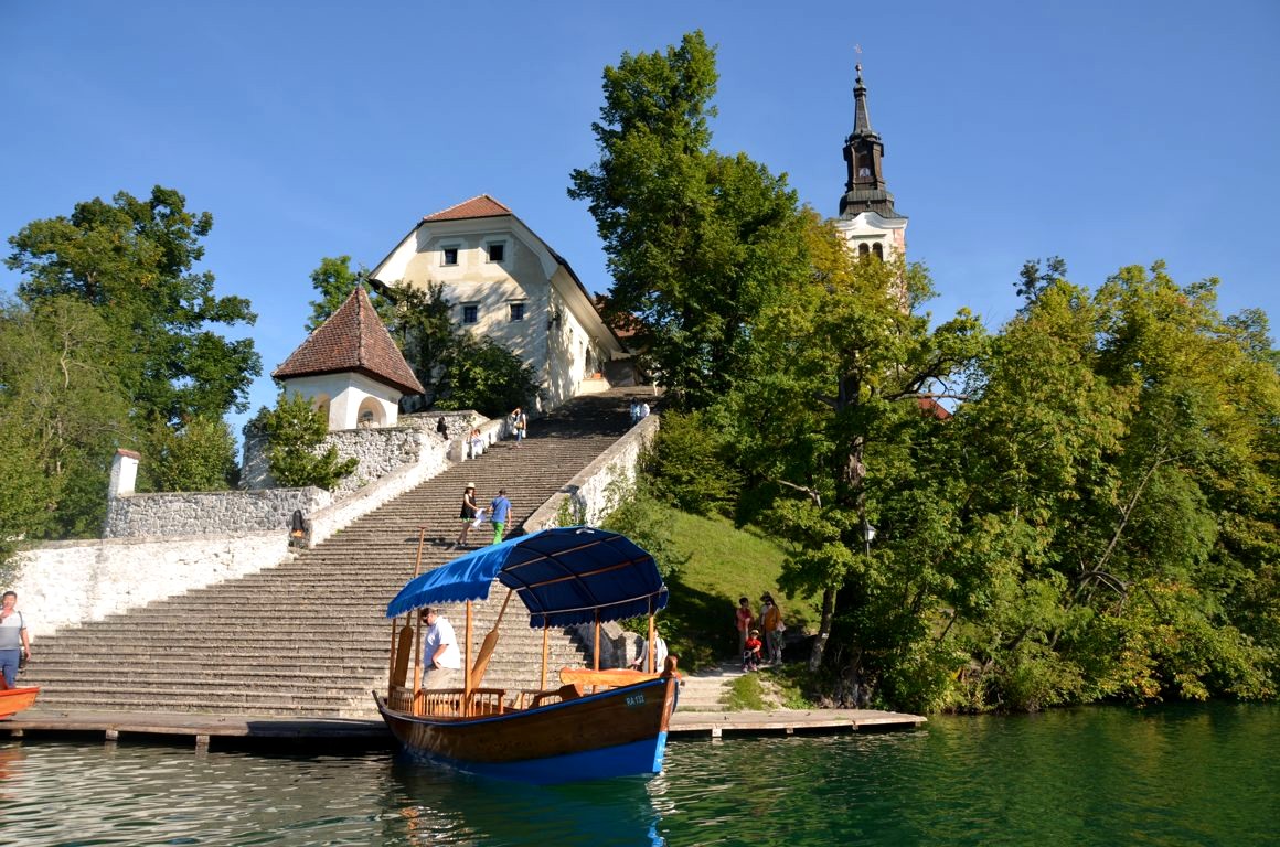 Après un voyage agréable en mini-bus, nous arrivons assez rapidement au Lac de Bled, au milieu duquel se trouve la petite île de Blejski Otok… la seule île de Slovénie !