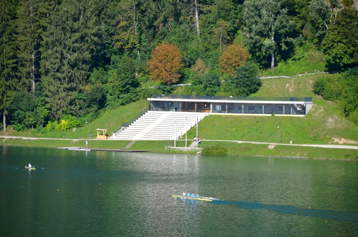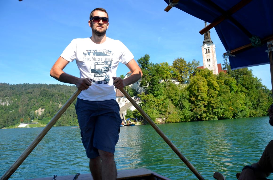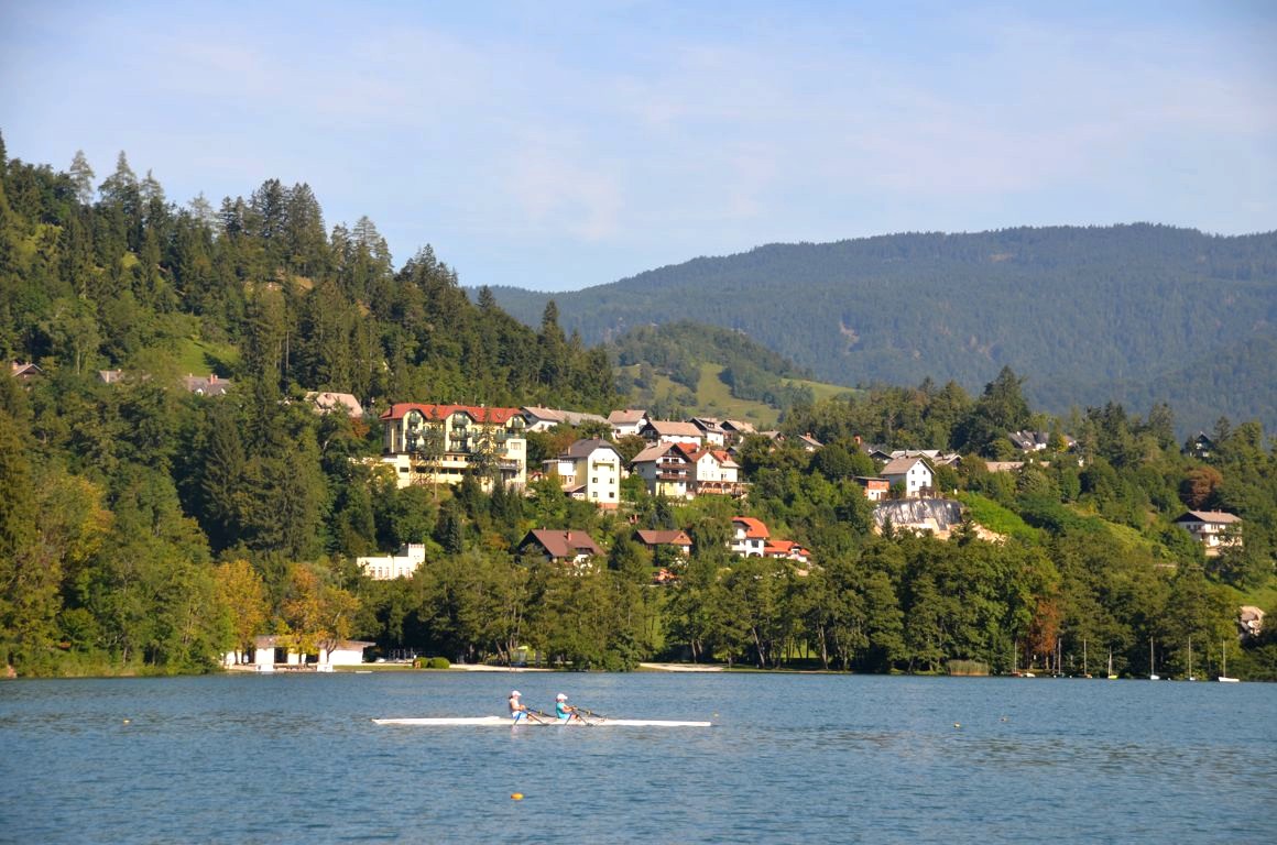 Depuis l’île, nous observons plusieurs personnes en train de faire de l’aviron de l’autre côté du lac : le lac de Bled a en effet accueilli à quatre reprises déjà les championnats du monde d’aviron !
