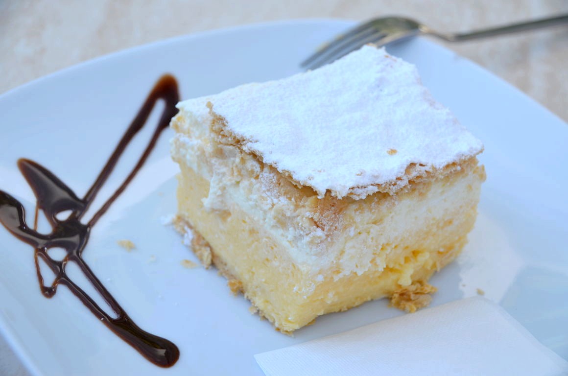 De retour sur les berges du lac, nous en profitons pour faire une petite pause à l’un des cafés qui bordent le lac et déguster la spécialité de la ville, le « Bled Cream Cake » ou « kremšnita » en slovène, un gâteau à la crème plutôt riche…