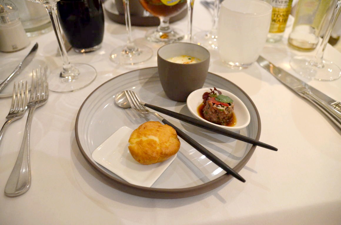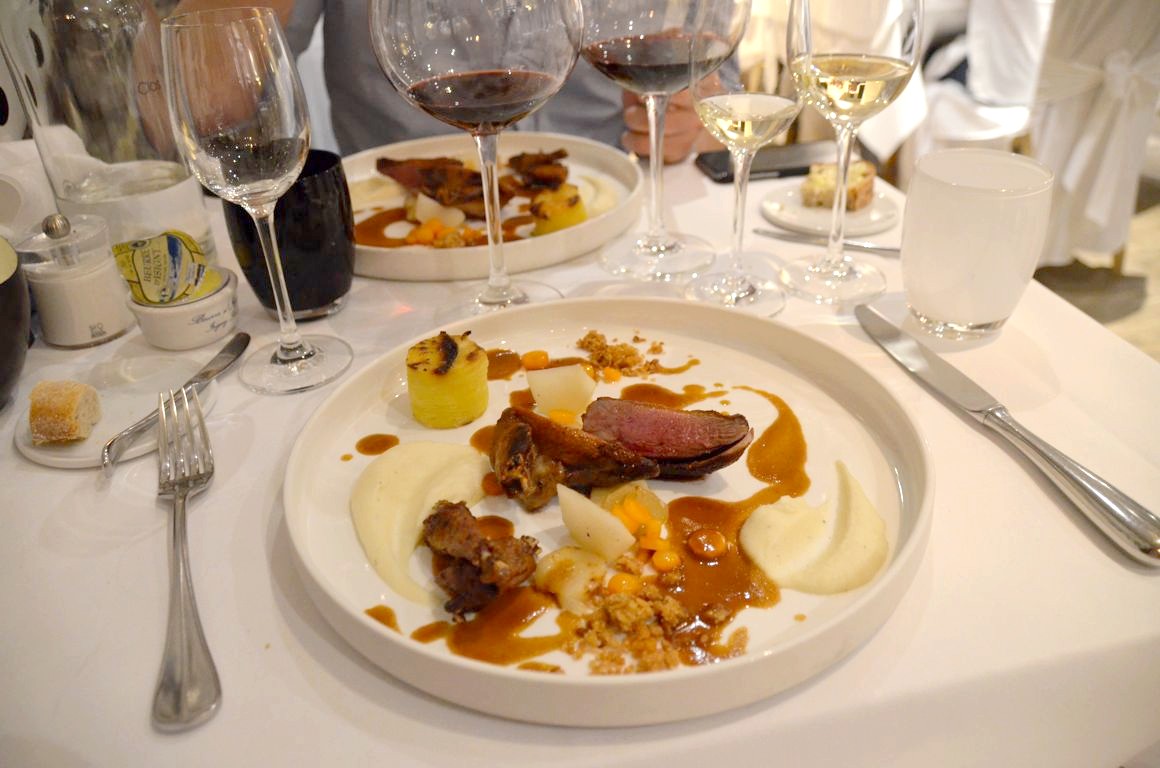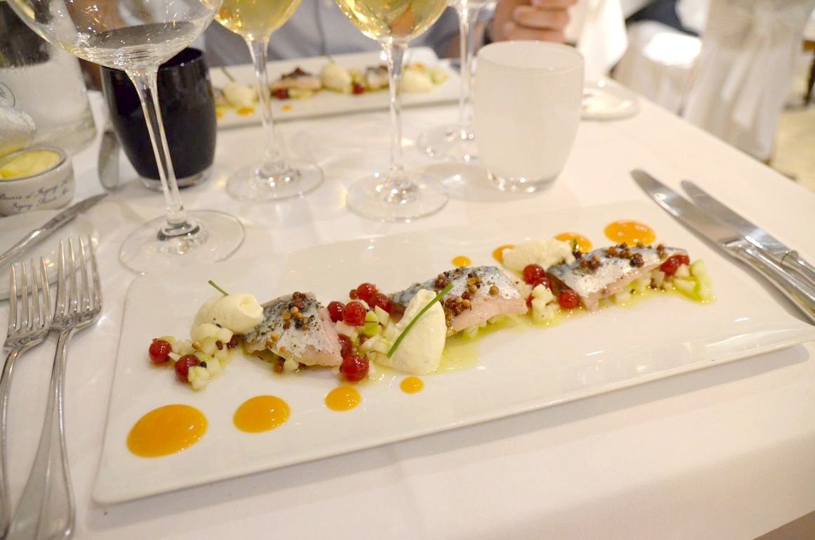 Après quelques mises en bouche, nous démarrons le repas avec une première entrée toute en fraîcheur, le filet de maquereau mariné aux épices (un peu trop de grains de poivre rose…), purée d’abricots et fraîcheur acidulée.