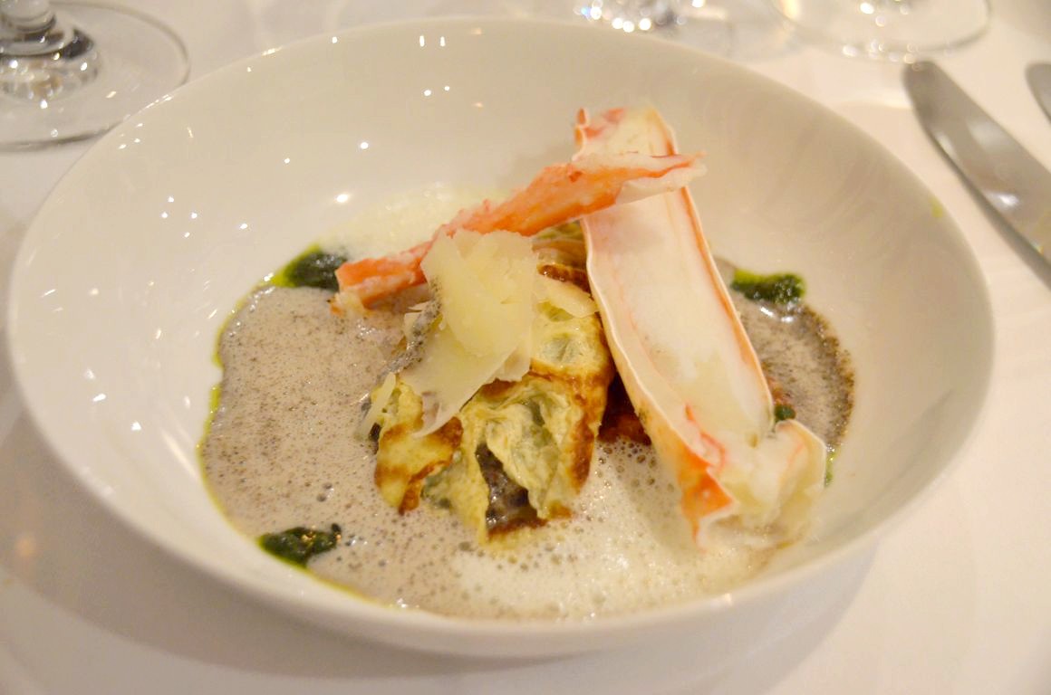 Nous passons ensuite au King crabe, risotto aux truffes, beurre noisette, tomates confites, et émulsion de parmesan : j’ai beaucoup aimé l’association du king crabe avec la truffe, même si le plat était un peu trop lourd à mon goût.