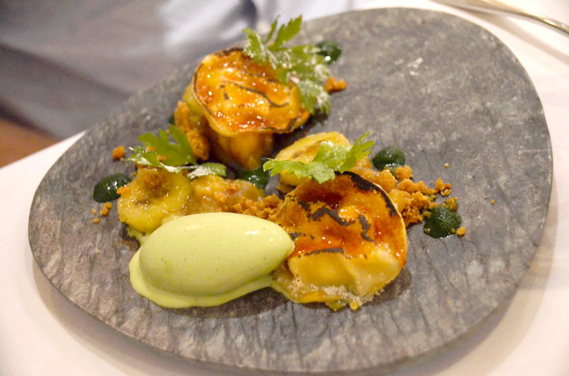 Le dessert est quant à lui plus surprenant : il s’agit de Ravioli de crème brûlée et banane, accompagnés d’un coulis de persil et de glace vanille. La banane étant ma kryptonite, je me suis pour ma part rabattue sur un dessert à la carte, un classique sabayon aux fruits rouges et glace vanille lui aussi très bien réalisé.