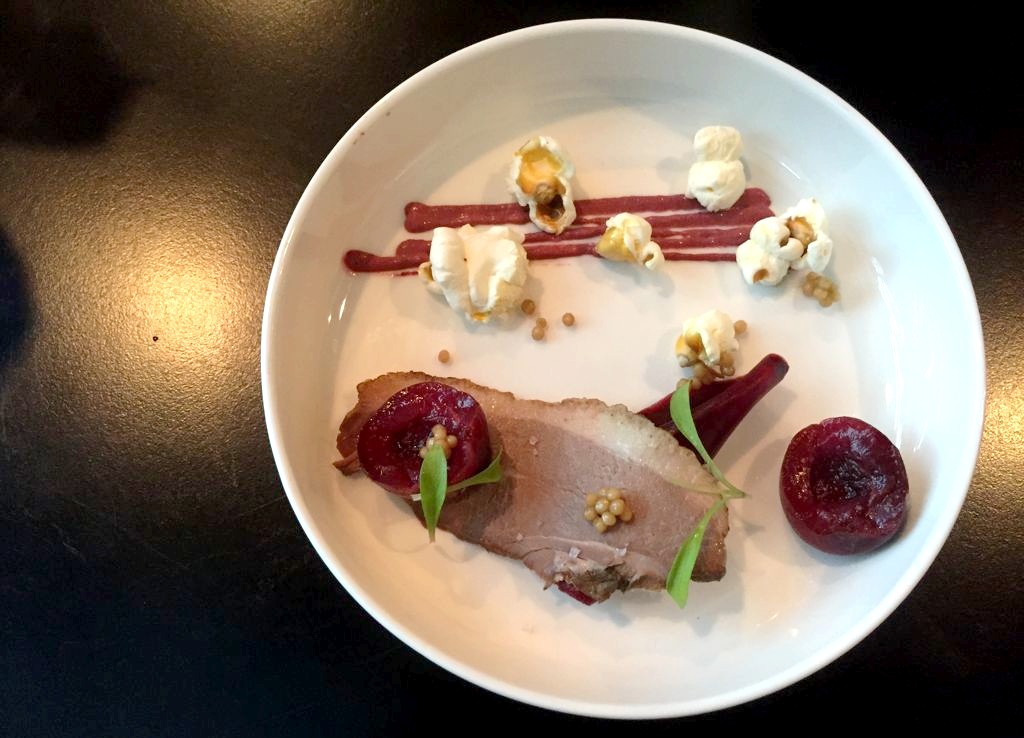 Popcorn à la mayonnaise de betterave, confit de canard à la cerise vinaigrée